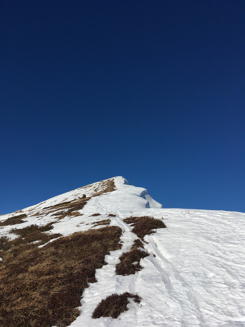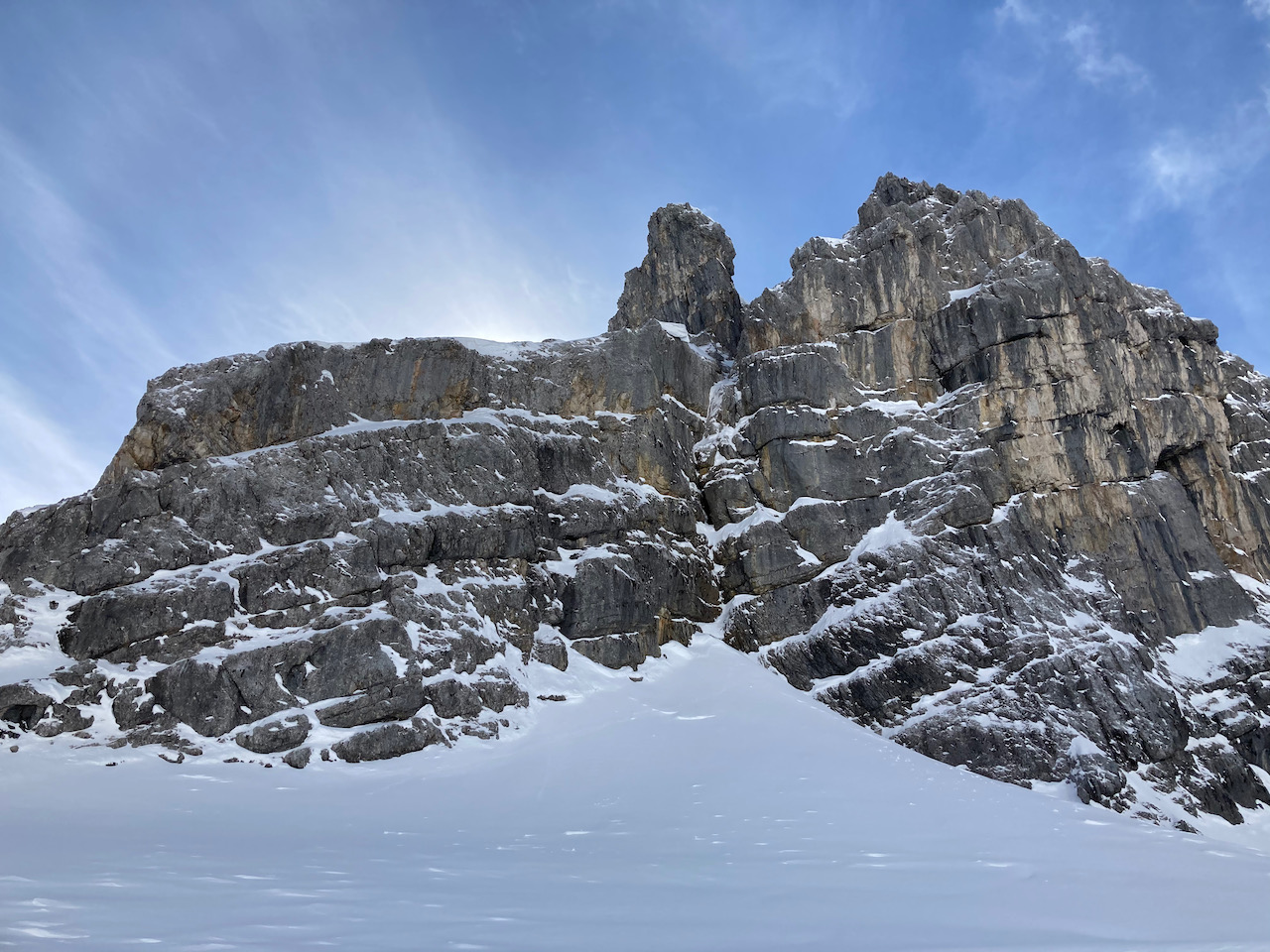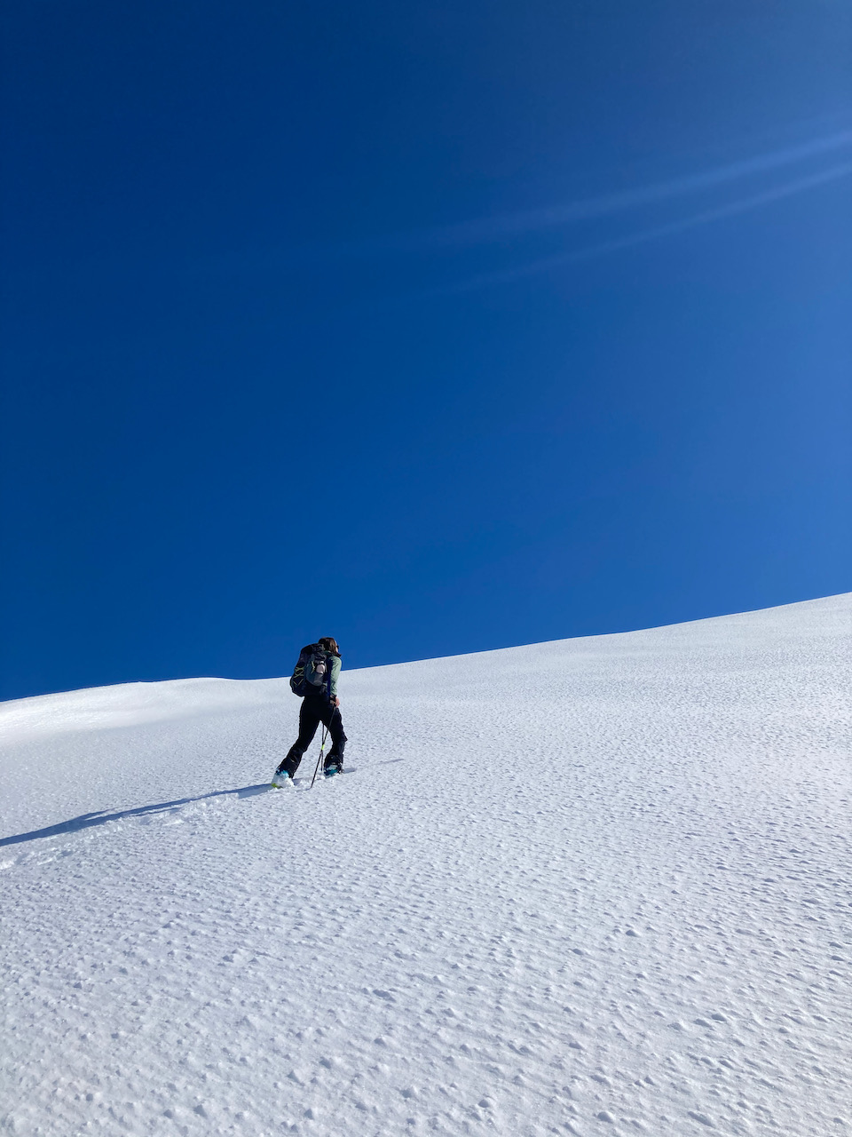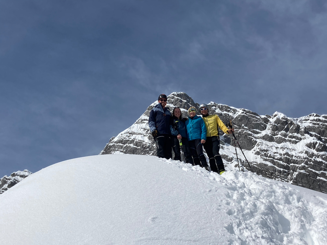 Aufm Weg zur Kreuzspitze, aber nimma aufn Haufgipfel ganga weil ma scho relativ spät dro warn. Schena steiler Anstieng, oben kurz Harscheisen braucht - Alternative is der Sommerweg rechts rum, hod a wengal einfacher ausgschaut. Richtig geile Tour de bei 18° im Tal echt no guad ganga is. Samy mit Schneeschuhen und Snowboard sche hochkämpft und grandiose Abfahrt verdient!