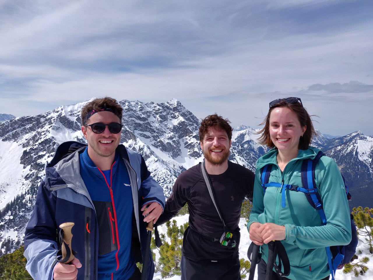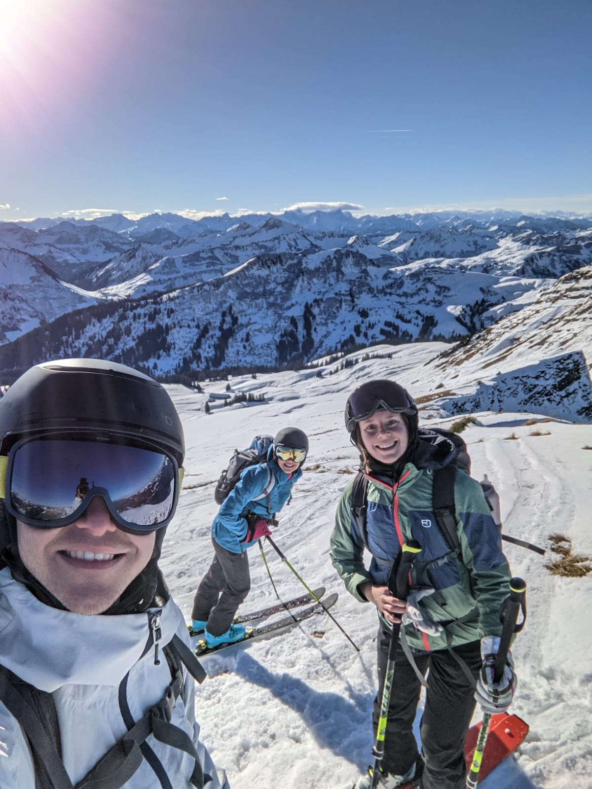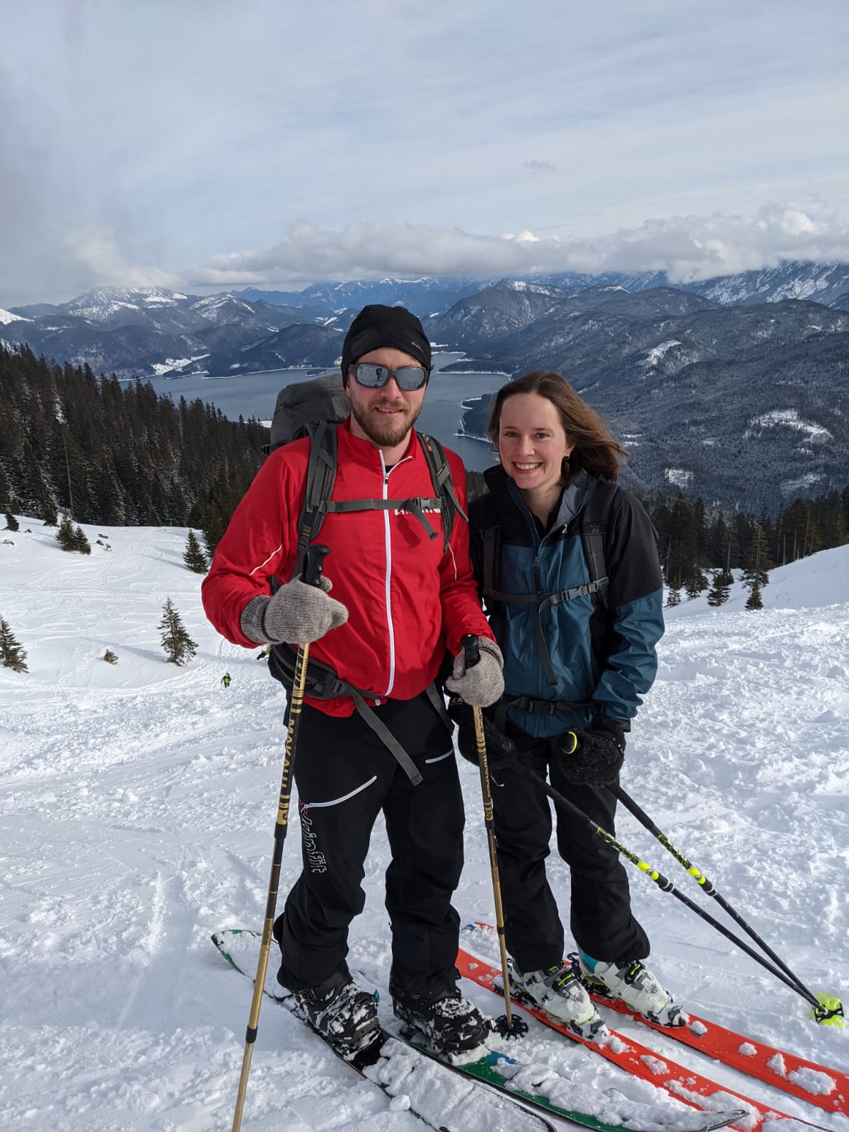 Trippelpremiere: erste Skitour von Lina, Rich und Anne! Lina mit dem Tourenski von da Erika unterwegs, Rich und Anne in Lenggries Splitboards ausgliehn. Relativ flott unterwegs gwen, aber hoid mit 500 andere. Oben schene Fernsicht und Brotzeit. Abfahrt hod fürd Lina echt einwandfrei highaud! Respekt. Unten no a Weißbier verdient. Parken 5€. Traumdog!