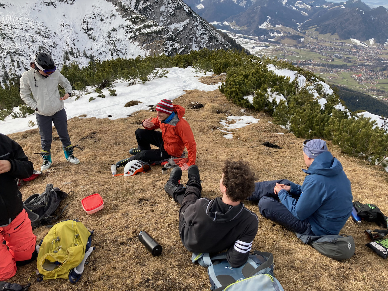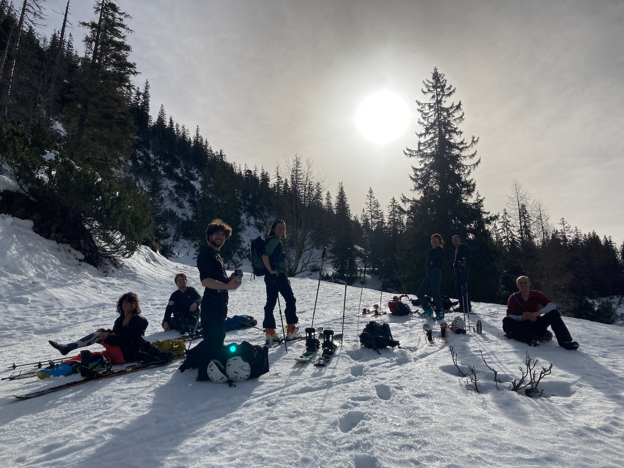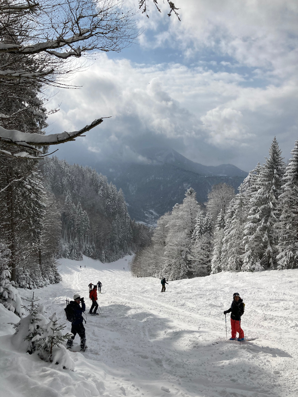 Erster Versuch auf die Kreuzspitze gegnüber, da war im steinigen Kar absolut kein Weiterkommen. Einen Parkplatz zurück Richtung Ettal dann links rauf auf die Scheinbergspitze war besser. Stef und Leo san no zu Fuß weiter zum Gipfel, Samy und i san glei abgfahn. Den Spuren folgend relativ früh nach links in den Wald rein, Abfahrt war ganz ok (besser als Aufstiegsspur), um dann auf den kleinen Forstweg zu treffen. Insgesamt nicht sehr lohnend bei dem wenigen Schnee.