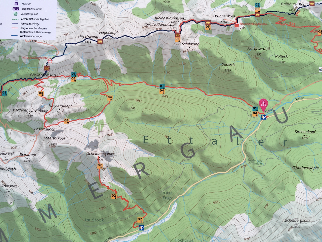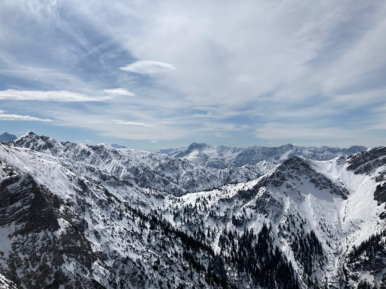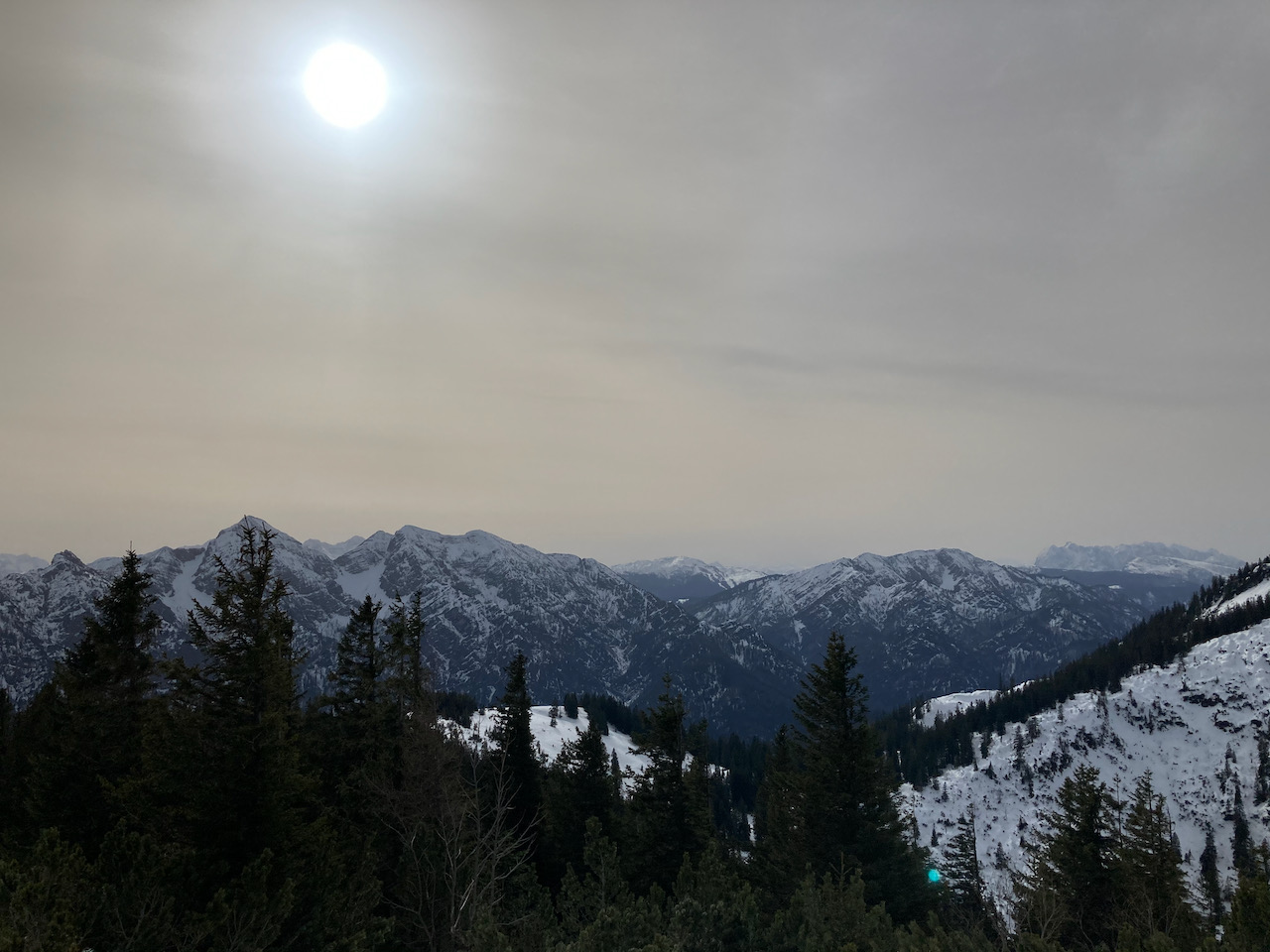 Erster Versuch auf die Kreuzspitze gegnüber, da war im steinigen Kar absolut kein Weiterkommen. Einen Parkplatz zurück Richtung Ettal dann links rauf auf die Scheinbergspitze war besser. Stef und Leo san no zu Fuß weiter zum Gipfel, Samy und i san glei abgfahn. Den Spuren folgend relativ früh nach links in den Wald rein, Abfahrt war ganz ok (besser als Aufstiegsspur), um dann auf den kleinen Forstweg zu treffen. Insgesamt nicht sehr lohnend bei dem wenigen Schnee.