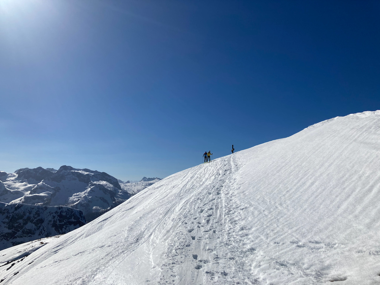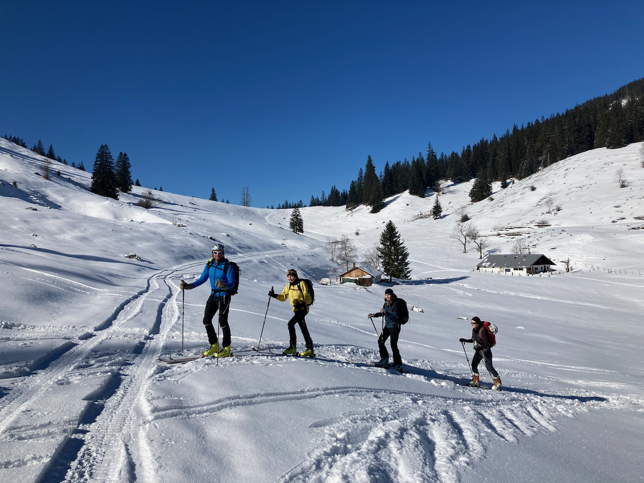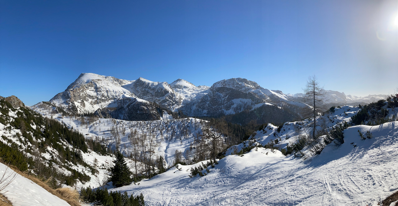 Eine Genuß-Reim wie ausm Bilderbuch! Wenig los, teilweise unverspurte Hänge, schöner Firn und wenig zum drong - und als Highlight hods a Weißwurschtfrühstück aufm Blankensteinsattel gem! Richtige schene Rundn mit extrem vui Alternativmöglichkeiten zu Abfahrt und Aufstieg. Wir ham uns für den wunderbaren Hang zu de Schneeböden entschieden, anstatt direkt zum See abzufahren. Ab Blankensteinsattel bis auf kurze Tragepassage Abfahrt bis zum Parkplatz möglich.