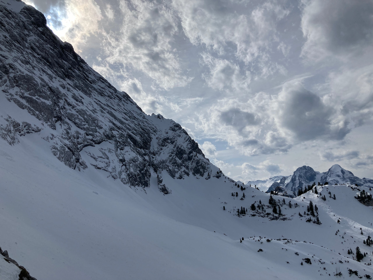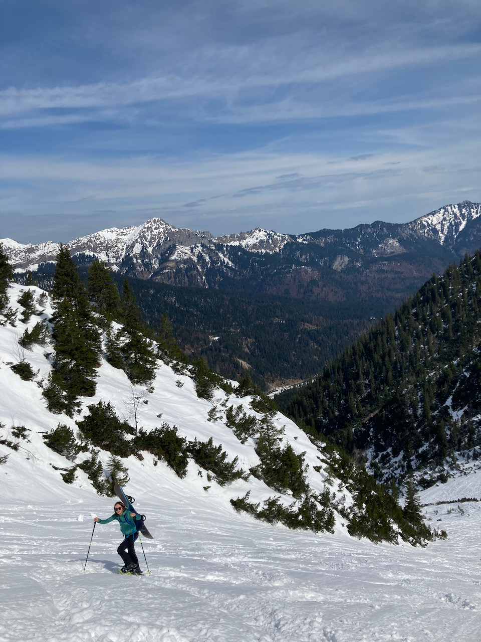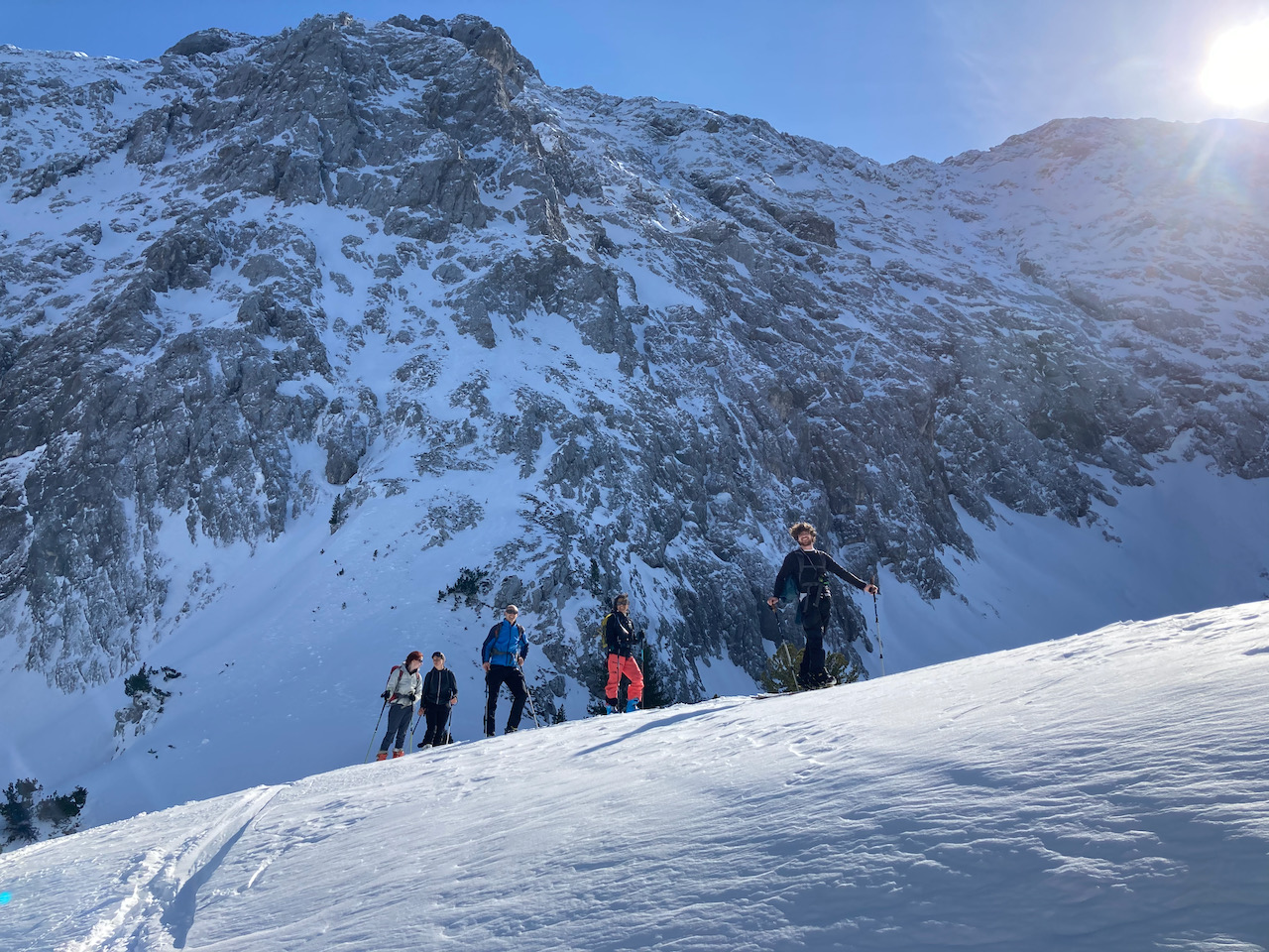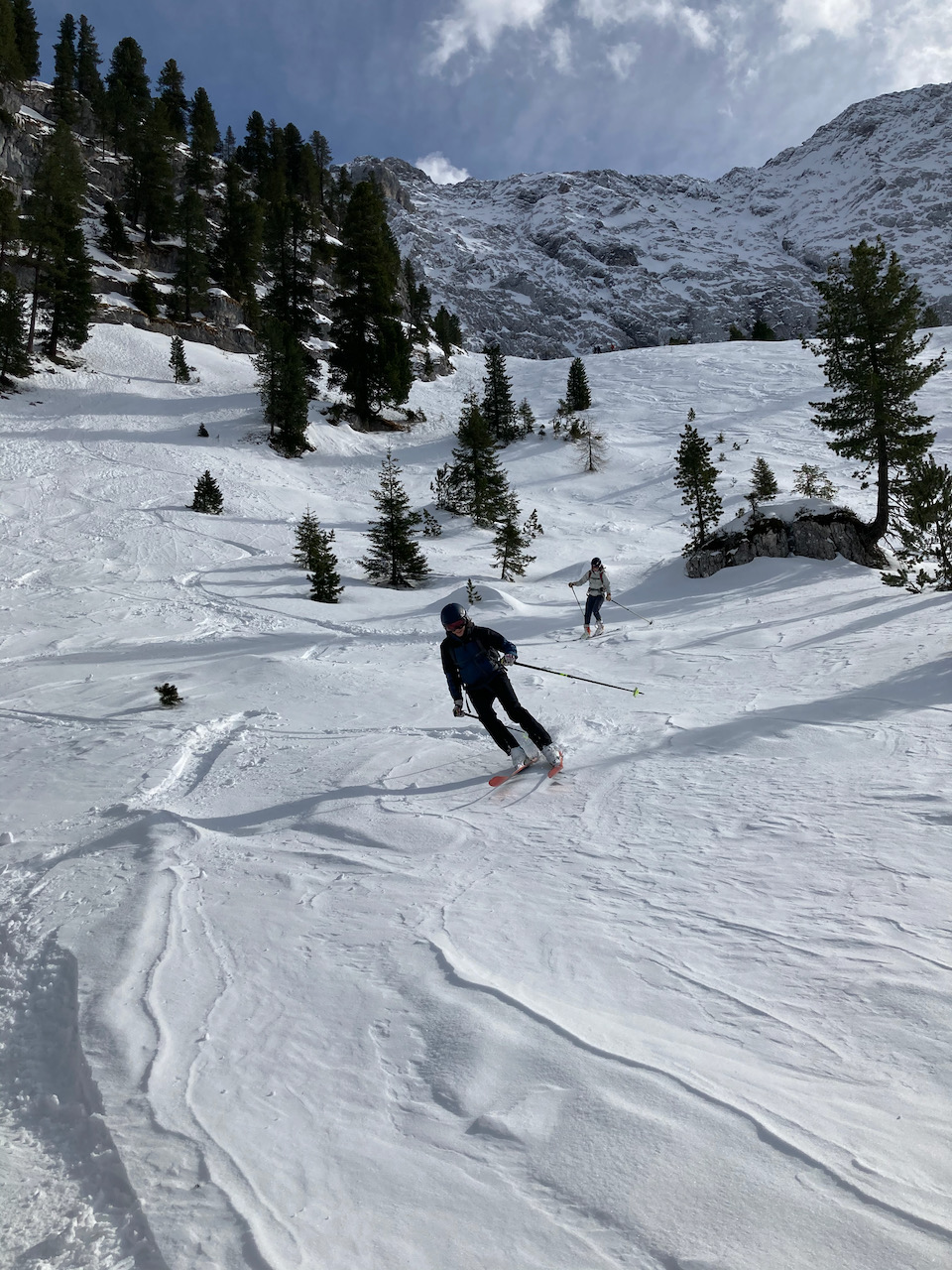 Erste Tour vom Schloss Elmau hinten ins Wetterstein rein, lange Forststrass mit Schnee bis zum Parkplatz. Erste Skitour für Sofia, Ausrüstung bei Garmisch classic ausgeliehen, top. Geiles Gebiet mit schene Varianten oben (steile Rinne und schöner Hang rechts). Aufstieg a vom Tal links möglich, dann aber mit Gegenanstieg. Traumtour mit Skilehrer Leo!