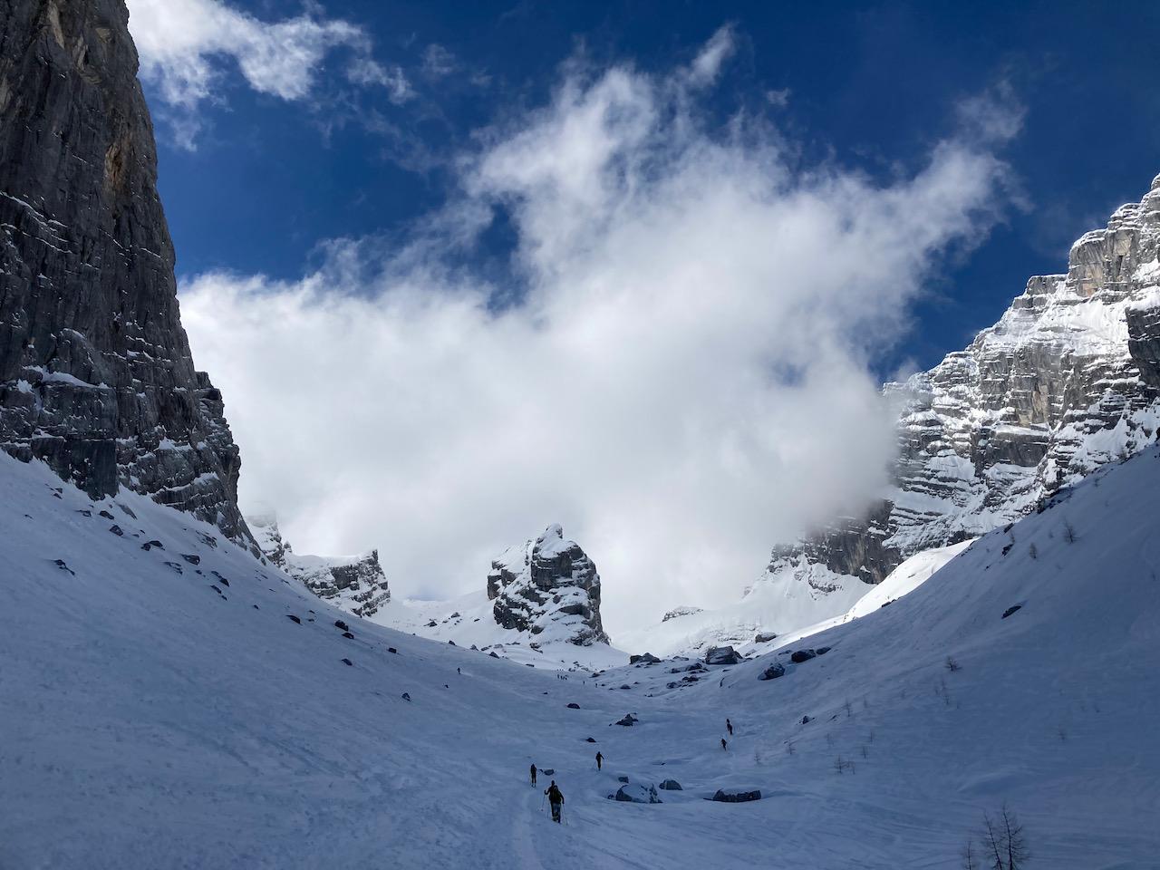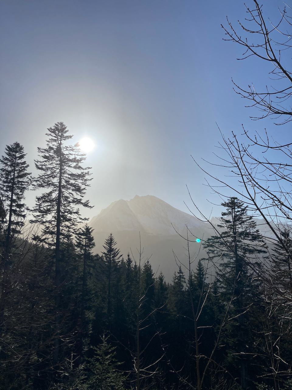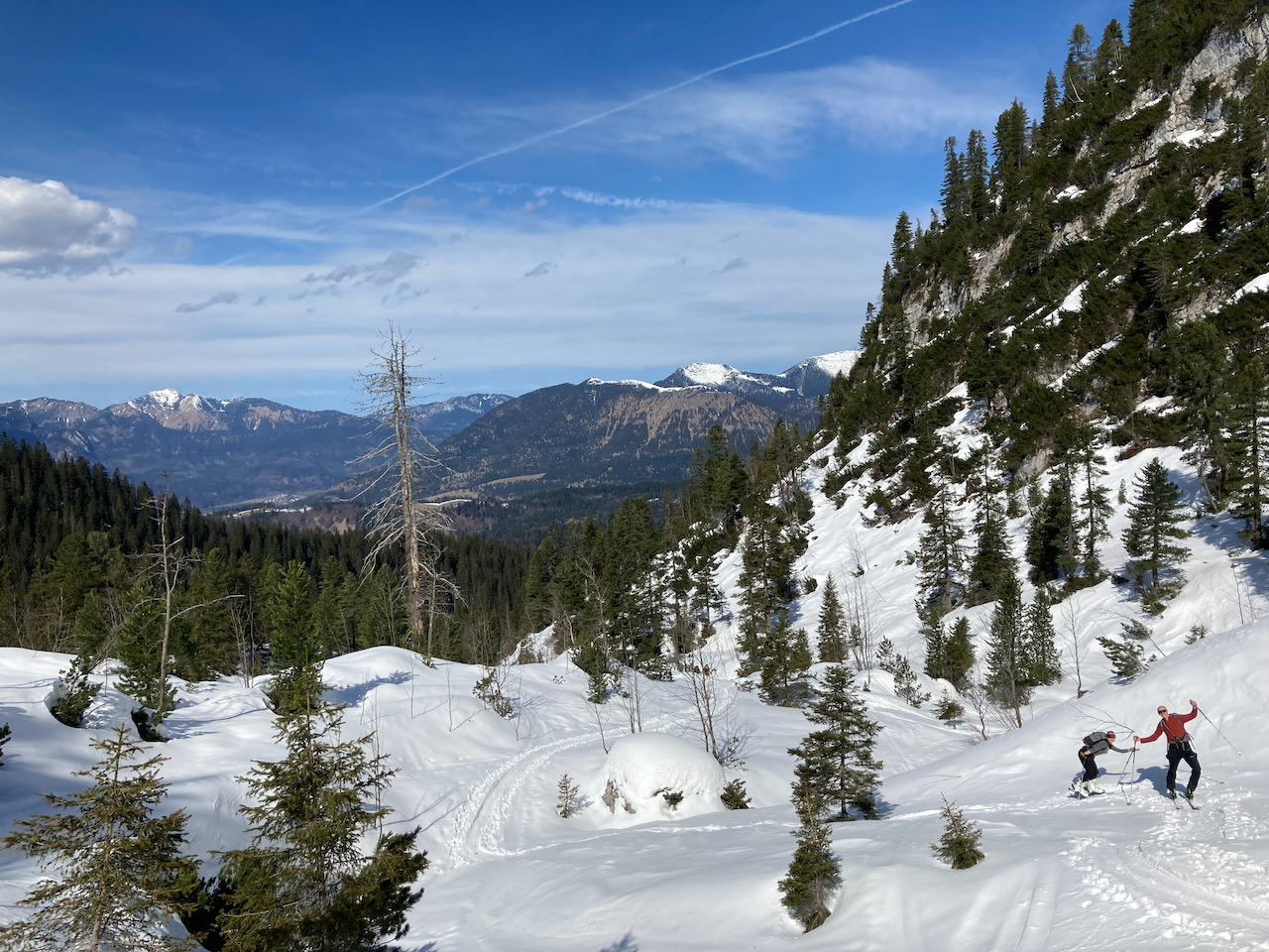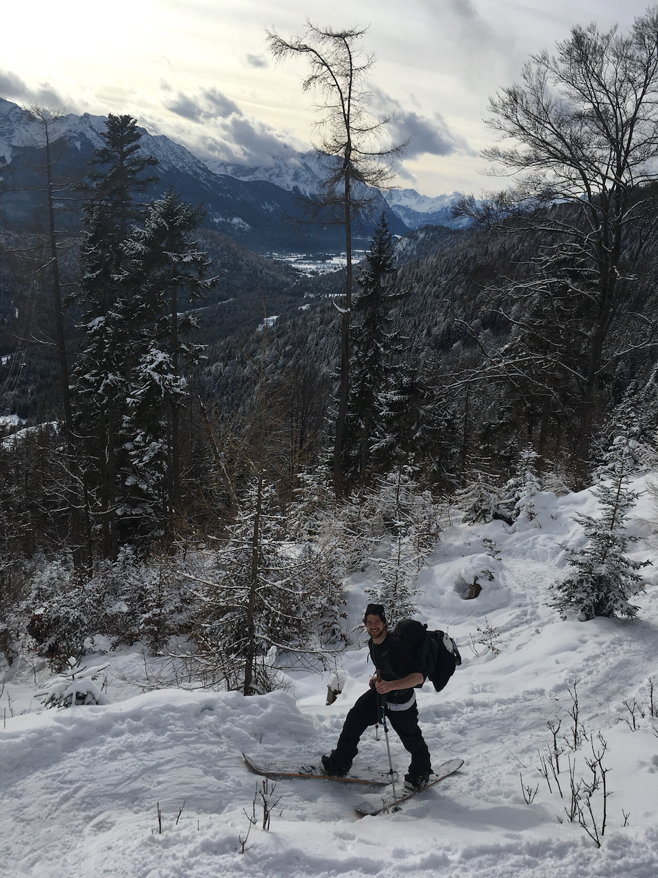 Erste Tour vom Schloss Elmau hinten ins Wetterstein rein, lange Forststrass mit Schnee bis zum Parkplatz. Erste Skitour für Sofia, Ausrüstung bei Garmisch classic ausgeliehen, top. Geiles Gebiet mit schene Varianten oben (steile Rinne und schöner Hang rechts). Aufstieg a vom Tal links möglich, dann aber mit Gegenanstieg. Traumtour mit Skilehrer Leo!