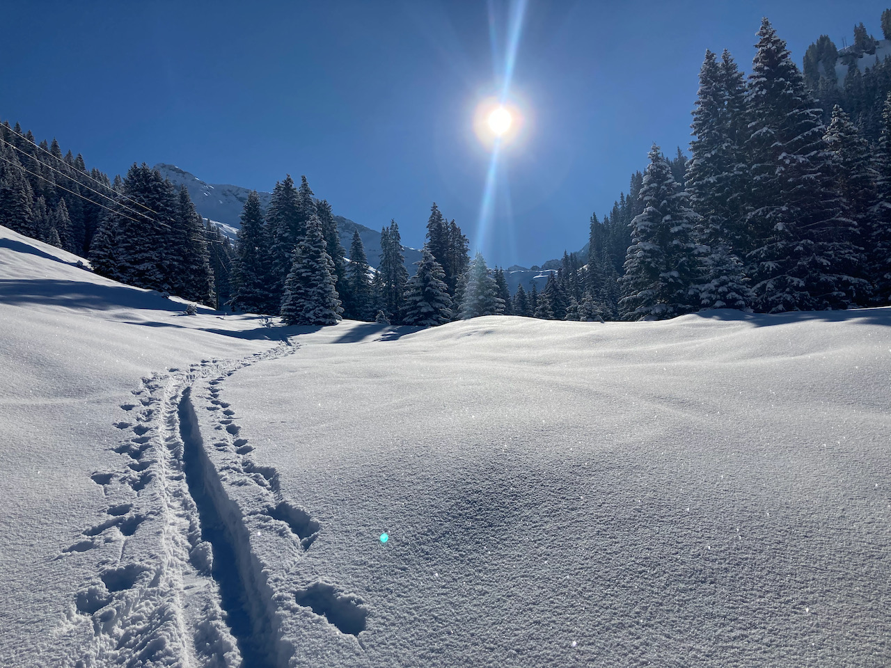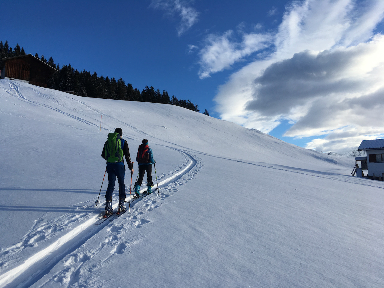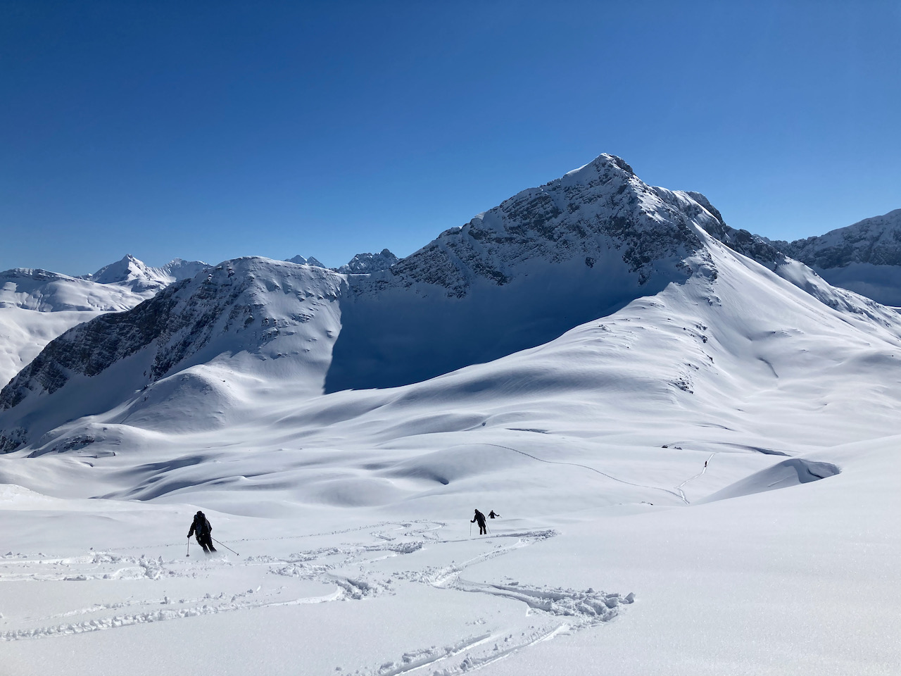 Die wahrscheinlich beste Tour in dieser Saison. Traumschnee, Traumdog, Traumleid! Am Pausehütterl links obe hoidn, sonst steigt ma zfriah auf, dann bei da Tälialpe links auffe zum Wöstersattel und links aufs Horn. Alternative dann warn die Schäferköpfe (bei uns zu verwächtet). Die Ersten nachm Neuschnee durch unverspurtes Gelände is einfach nur Hochgenuss! Beschtes Pauseblatzl mit Blick auf Lech und netter 90jährigen Oma.