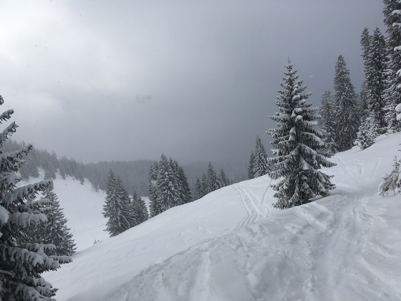 Schneefall, ab Stoalingoim dicht bewölkt ohne Sicht