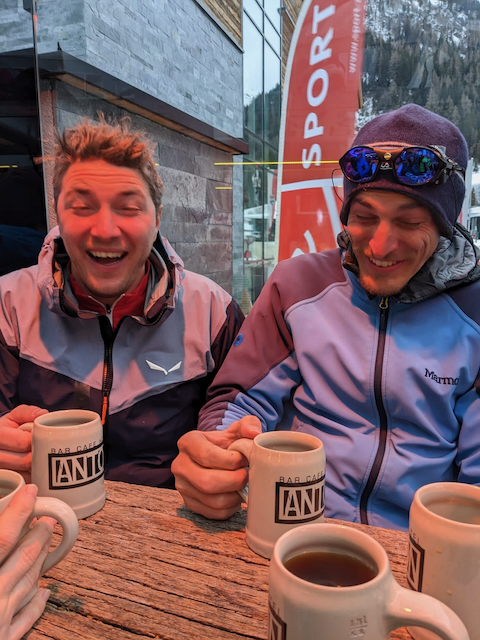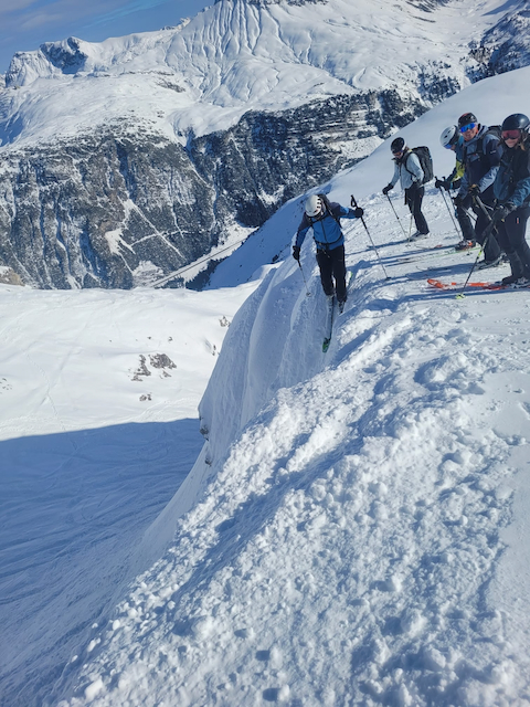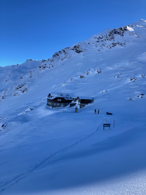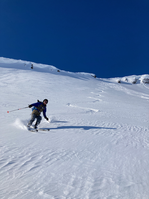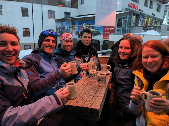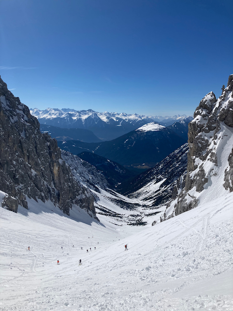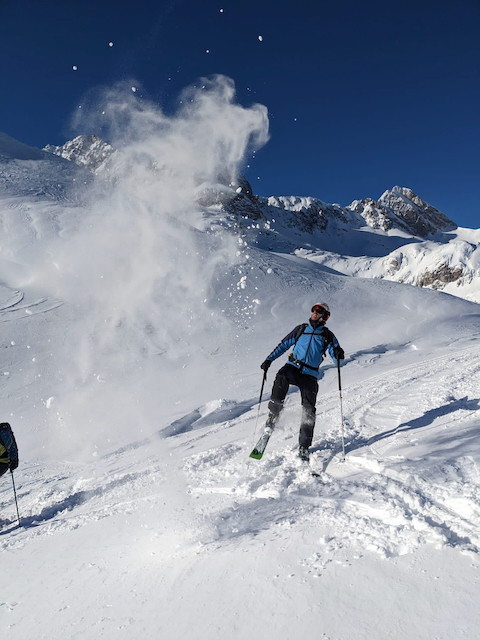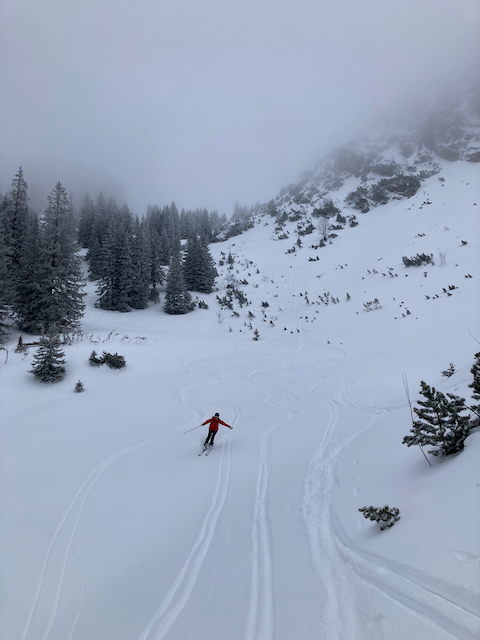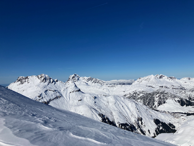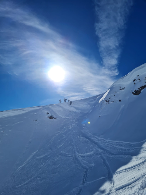 DAV Kurs Skifahren im freien Gelände für Fortgeschrittene in Flirsch am Arlberg, Berghotel Basur. Sauber wos glernt beim Achim Zimmer: Batschn viare, Oberkörper geht nur in da vertikalen, inneren Schweinehund überwinden und ned nach hinten lehna, Verse hoch und Kurvn ausfahn, Schulter locker und Disco. Leider hoda si am Ende vom 2. Dog de Schulter brocha bei da letztn Abfahrt auf da Piste, danach samma no a weng solo unterwegs gwen. Geile Varianten in Zürs: Erzberg Variante mit leichtem Anstieg (manche san a zu Fuß), entlang da Seekopfbahn, Madlochbahn rauf und dann Abfahrt vorne rum Richtung Zug (2 Felsriegel maus ma queren)mit Traum Hängen.