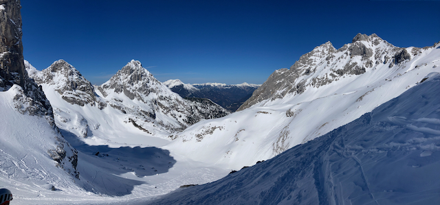 Tipp vom dünnen Kellner mit de Sprüche, dass Kolmkarspitze whrs guad geht. Übernachtig, verkatert und mit Wasserblosn aufbrocha und echt no a boa geile Hänge dawischt. Nach Topfenschmarrn gmiadlich über Forststraß abgfahn in unter na hoibn Stund. Immer wieder a Traum!