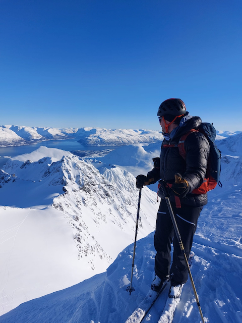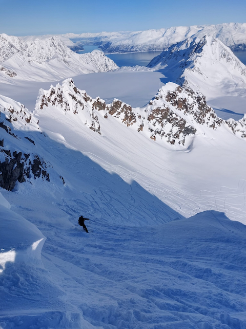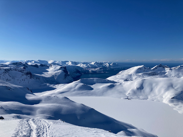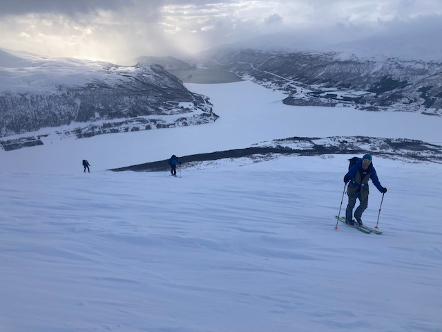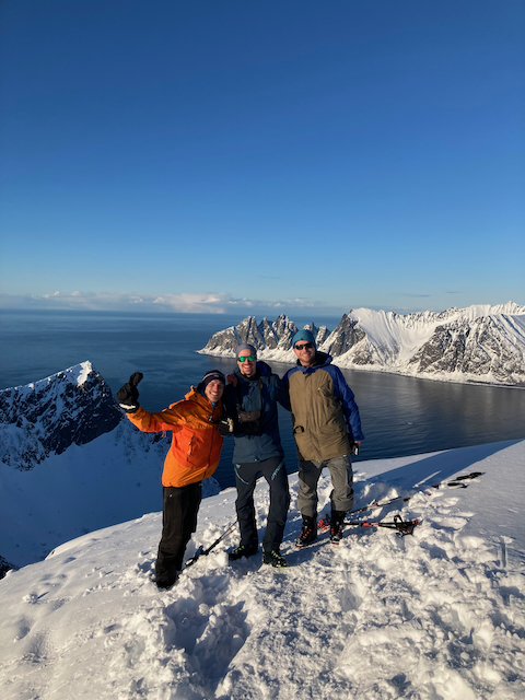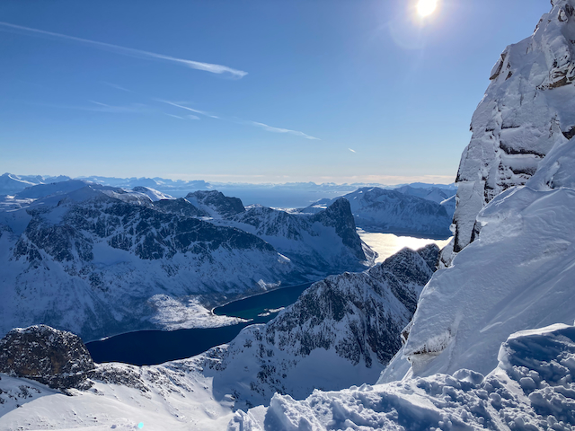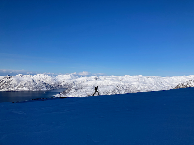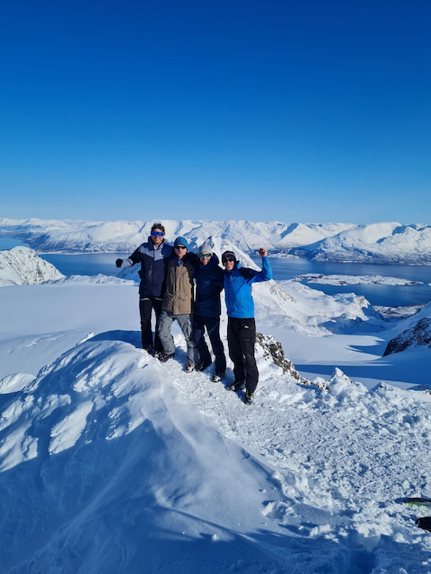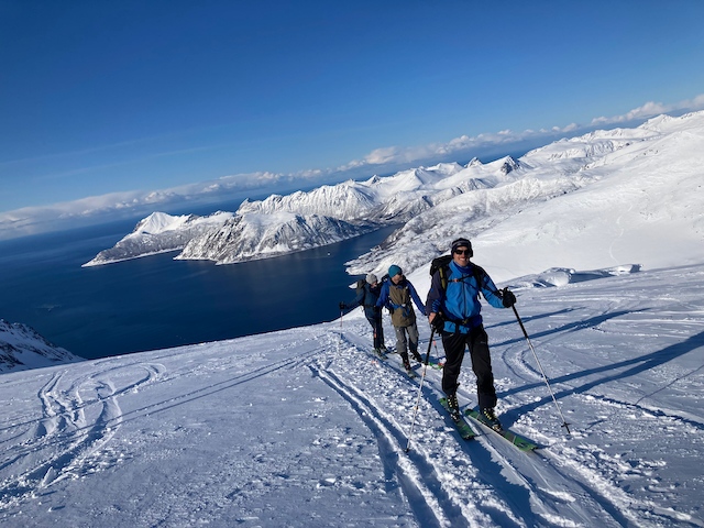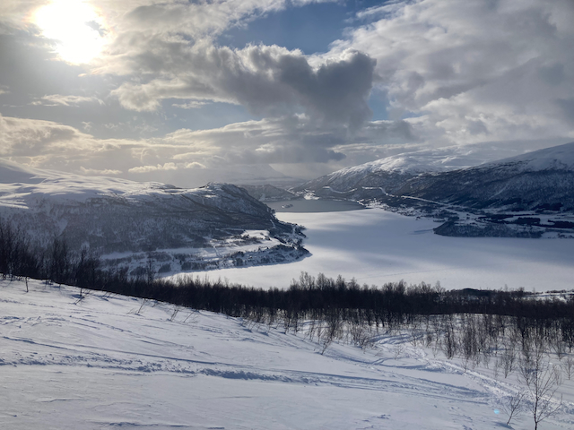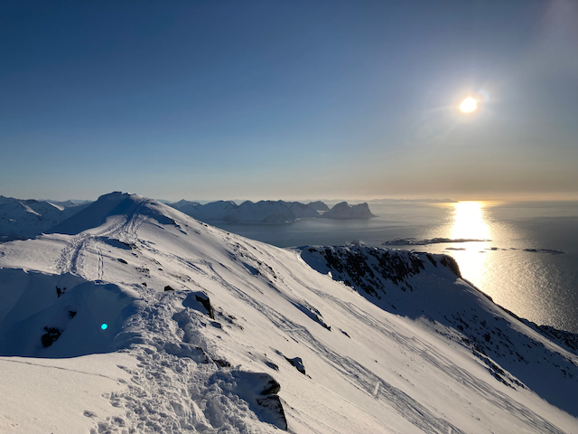 Erste Skitour in Norwegen, a unglaubliche Kulisse! Unten de Fjorde, oben de wuid verschneiten Zacken. Oben a boa Schweden droffa, de a steile Variante abgfahn san, mia san den Aufstiegsweg wieder obe. Übernachtung in am lässigen Haus a Stickerl über Finnsnes.