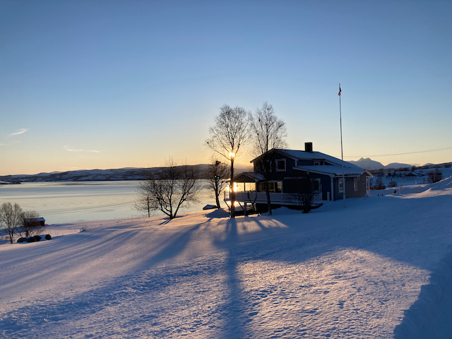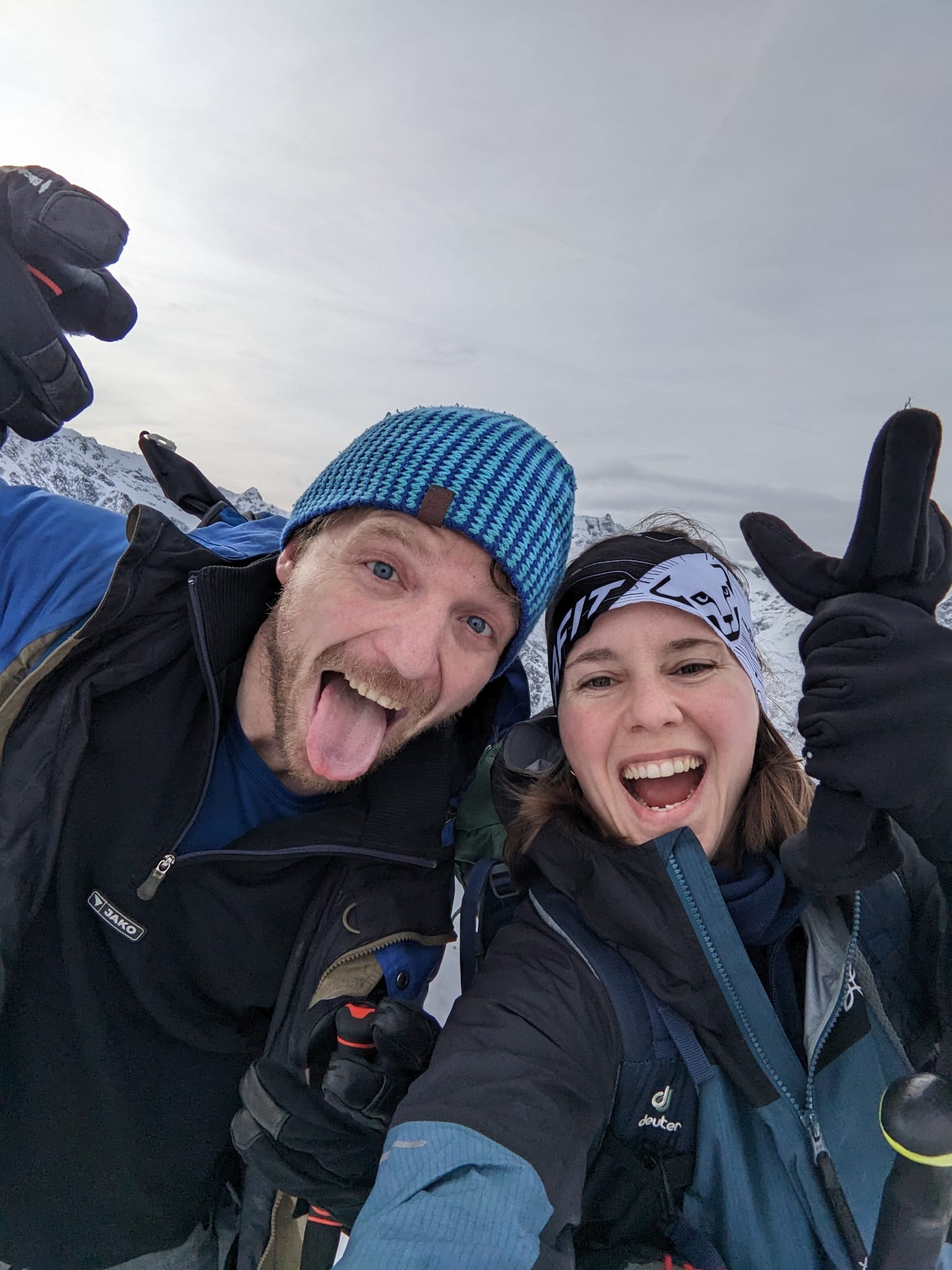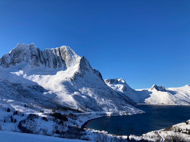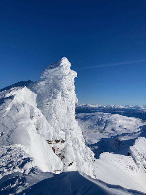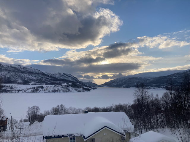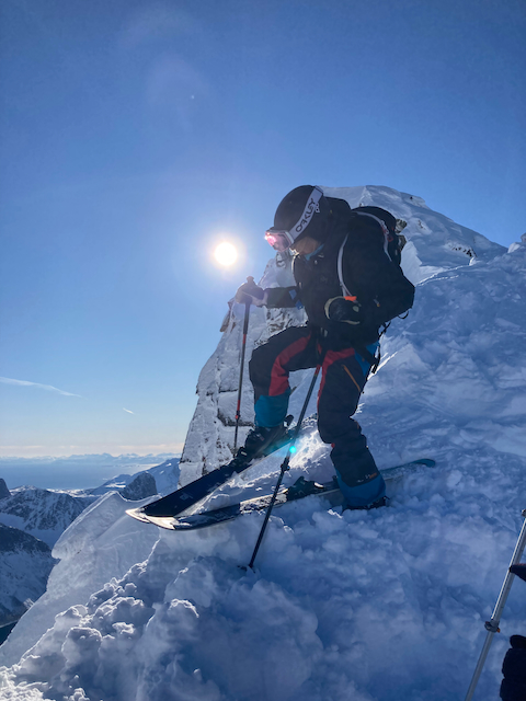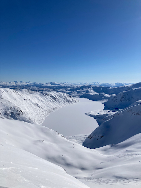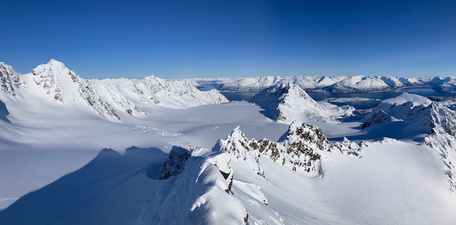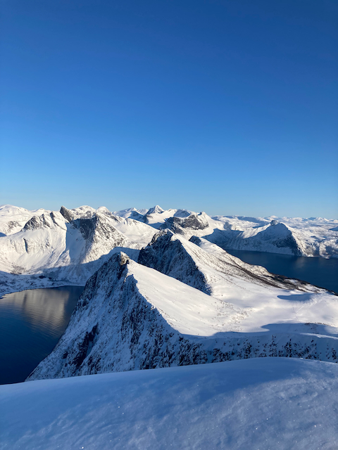 Erste Skitour in Norwegen, a unglaubliche Kulisse! Unten de Fjorde, oben de wuid verschneiten Zacken. Oben a boa Schweden droffa, de a steile Variante abgfahn san, mia san den Aufstiegsweg wieder obe. Übernachtung in am lässigen Haus a Stickerl über Finnsnes.