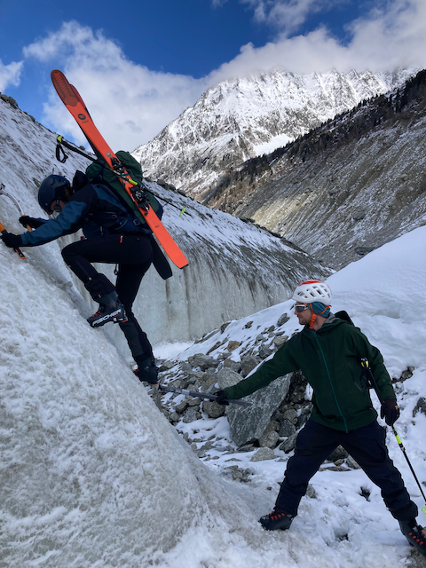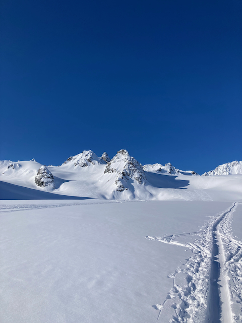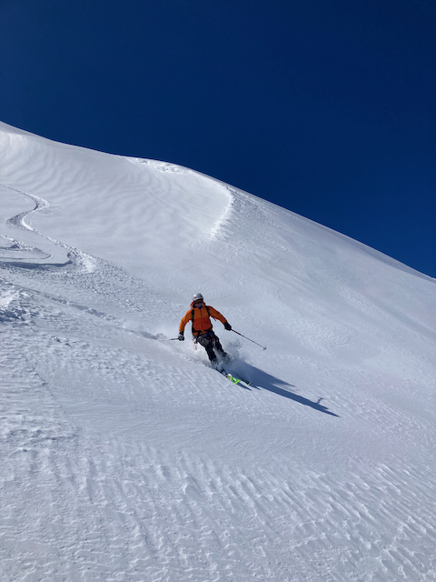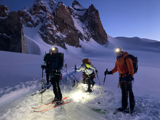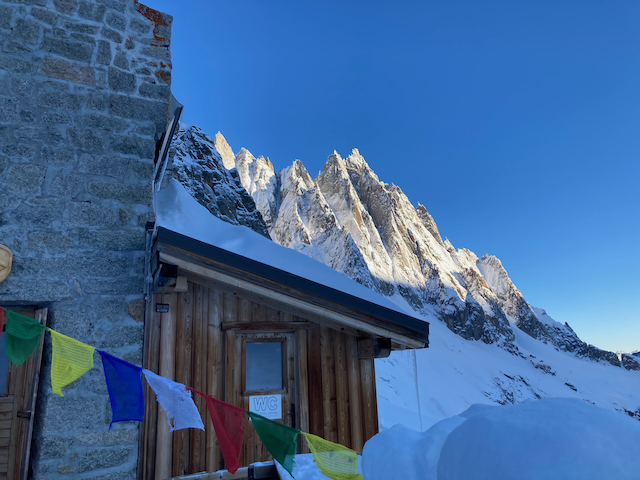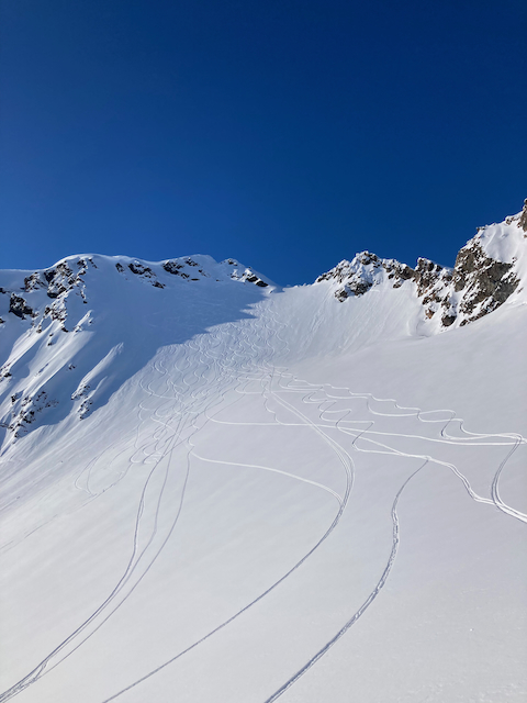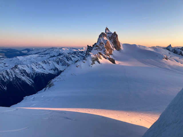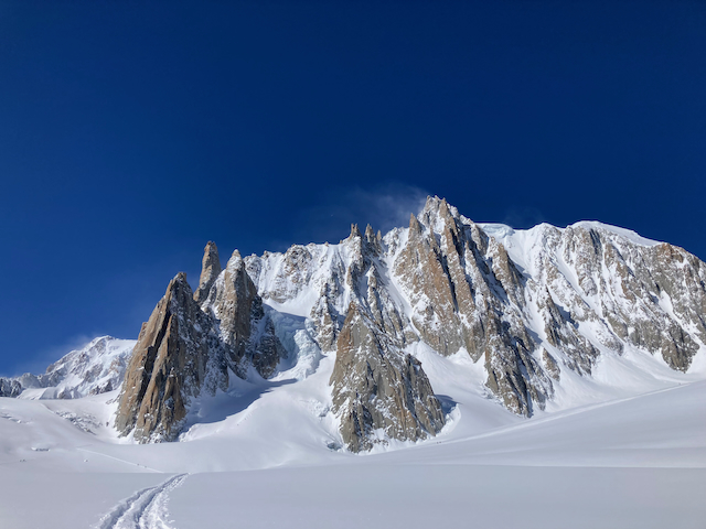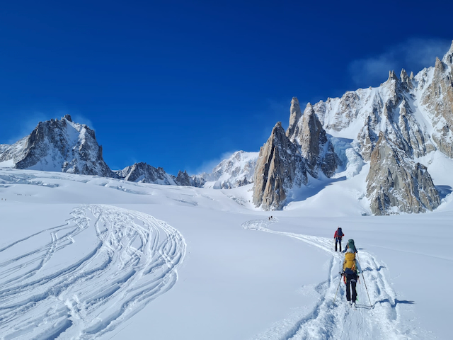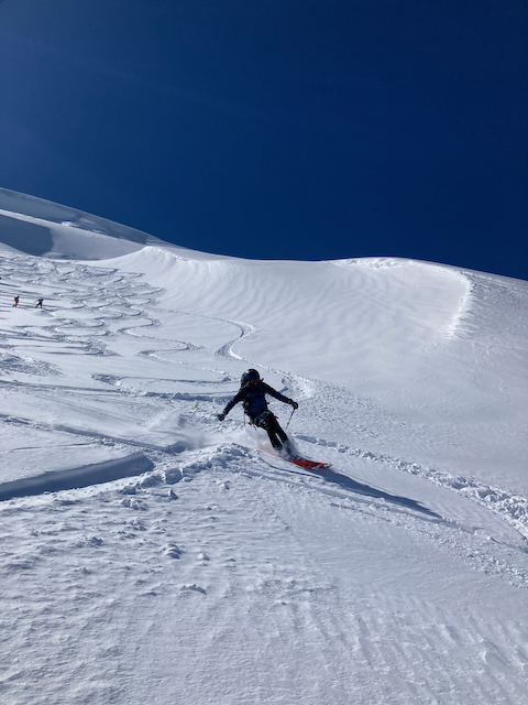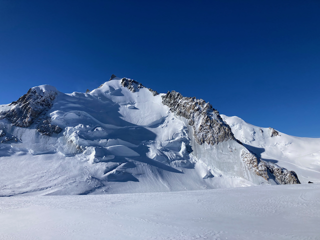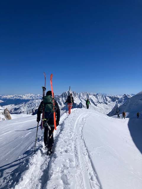In da Friah mit blauem Himmel und bestem Blick auf Dent du Geant gstartet. Teilweise den ersten Teil no a weng spuren miassn, dann san immer mehr Skifahrer vom Vallee Blanche entgegen kema. Traum Kullisse, vui Leid a zu umliegende Gipfel unterwegs. 2 ganz Wuide san as Jager Couloir (55°) gfahn, Steilwand Richtung Tacul rauf. Kurz vor da Hütte ham Leo und Stef mit 4 Italiener no de Route aufn Tacul gescouted. Koa Spur dafür an haufn Schnee drin. Bis circa zur Hälfte hods aber mit massig Spurkraft guad klappt. Entscheidung: wir probierns morgen.