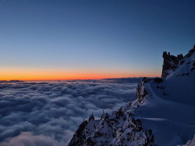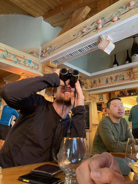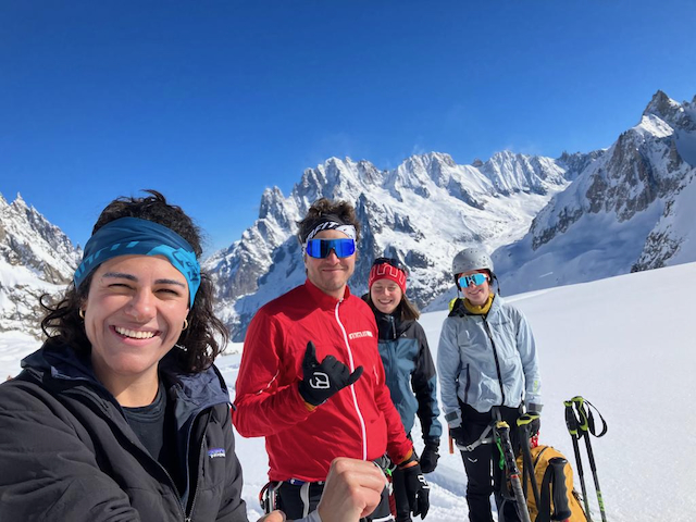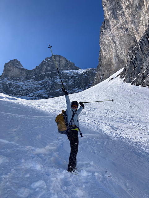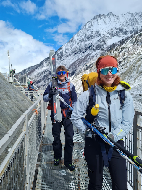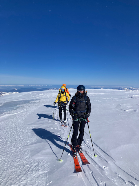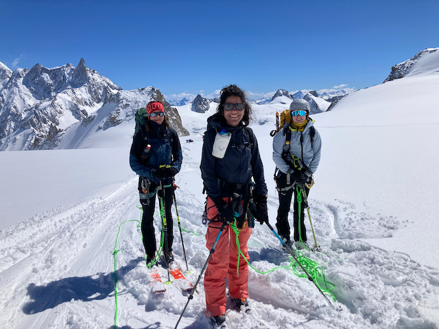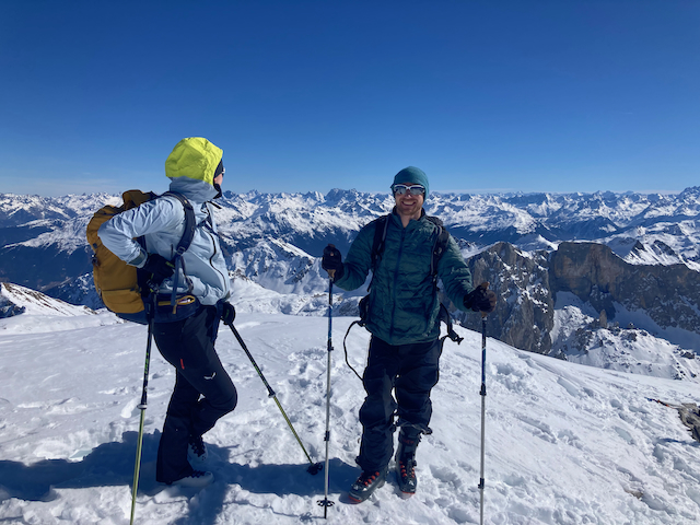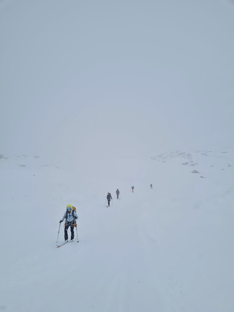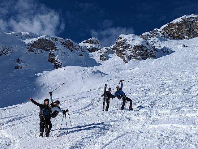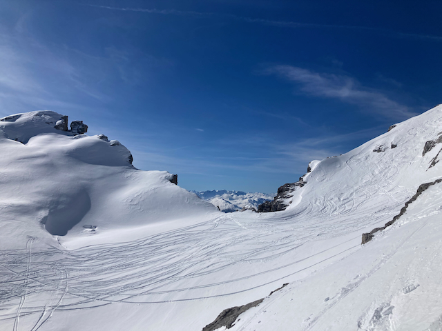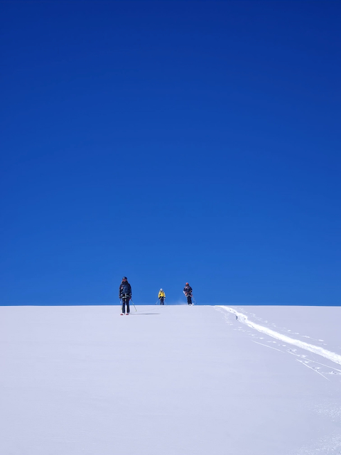 In da Friah mit blauem Himmel und bestem Blick auf Dent du Geant gstartet. Teilweise den ersten Teil no a weng spuren miassn, dann san immer mehr Skifahrer vom Vallee Blanche entgegen kema. Traum Kullisse, vui Leid a zu umliegende Gipfel unterwegs. 2 ganz Wuide san as Jager Couloir (55°) gfahn, Steilwand Richtung Tacul rauf. Kurz vor da Hütte ham Leo und Stef mit 4 Italiener no de Route aufn Tacul gescouted. Koa Spur dafür an haufn Schnee drin. Bis circa zur Hälfte hods aber mit massig Spurkraft guad klappt. Entscheidung: wir probierns morgen.