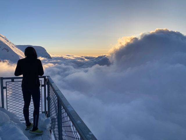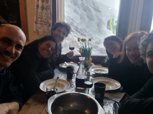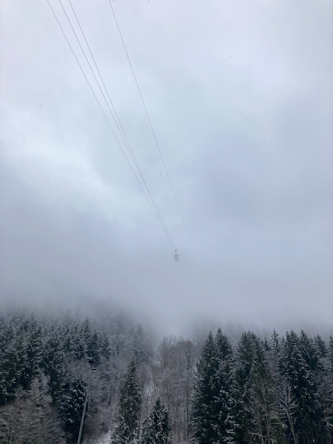 Mit da Zahnradbahn vo Chamonix nach Montenvers (37€ Hin und Retour), dann kurzes Stickerl mit da Gondel, Rest z Fuaß bis zur Eishöhle. Ab do mit de Ski as Mer de Glace rauf zur Requin Hüttn (teilweise am Seil). Aufm Weg einzelne Skifahrer droffa, des muas aber no ned bsonders guad gwen sei zum Abfahn bei Nebel und Schnee. Requin is a nette gloane Hüttn, Essen war guad aber mitm Löffel derf ma ned aus da Schüssel essen!