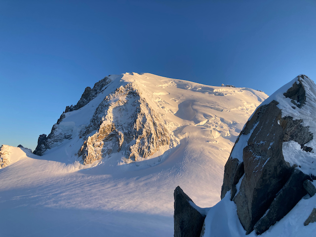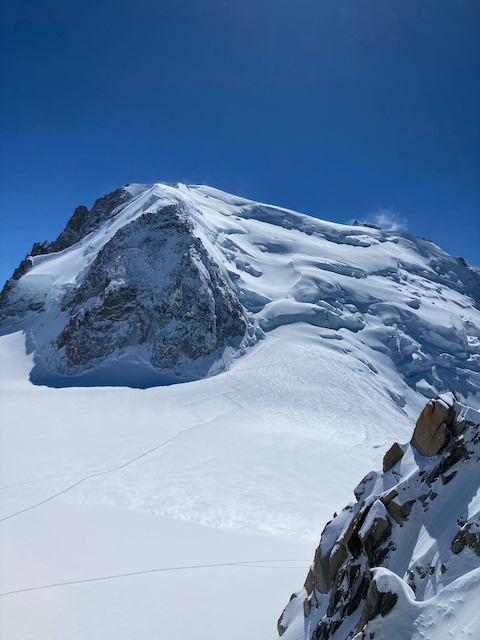 Um 5:00 Uhr aufgstandn und dann rechts rum rauf zum Tacul. Letztes Jahr san de Leid eher links rum ganga, aber rechts rum hod ma guad durch de Seracs gfundn. 1 Stoi wos a bisserl steiler war (mit Steigeisen und Pickel ganga), sonst guad mit Ski (bzw Ski am Rucksack) gehbar. Den ganz letzten Gipfel hamma aus Zeitgründen auslassn, des Tacul Plateau war unser Ziel. Aufm Weg runter fast Ski weggwen bei Abfahrt durch den Steilhang (zum Glück Samys Hand nur so gestreift, dass er oamoi umdraht hod und nix schlimmeres basiert is). Abfahrt durchs Vallee Blanche war wundersche, sau lang (insgesamt 2400hm), extrem zerfahn aber unten hamma easy de Bahn zruck dawischt (mit ca 200 andere Leid). Überschreitung aufn Mont Blanc wär whrs a Nummer zu krass gwesen, aber der Tacul war a extrem lohnende und schene Saisonabschlusstour!