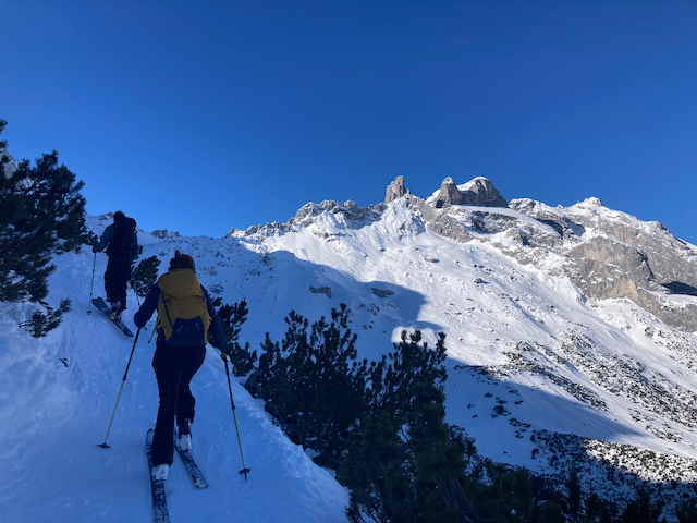 Dieses moi außenrum durchn Tiergarten aufgsting, deitlich gmiadlicher. Mittleren Turm a no mitgnumma. Abfahrt oben a weng windpresst, nach steiler Querung richtig guad und teilweise unverspurter Nordseitenpulver. Leider is ma da Fersenautomat vo da rechten Bindung brocha nach am gloana undramatischen Purzelbaum. Nach 15min Graben hodn da Stef wieder gfundn, mit Kabelbinder vo am Andern fixiert und guad abfahn kinna.