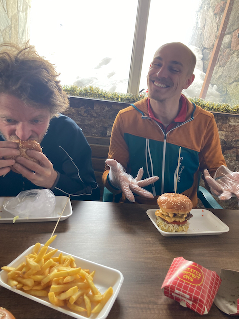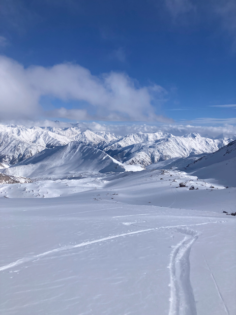 Letzte Skitour in Georgien für dieses Mal. Nach Schnapsabend mit Schweizer Mädels doch erst Mittag aufkema und recht spät gestartet, aber top Auskatertour auf die Südseite vom Mount Bidara, auch Pentagon Abfahrt genannt. No a boa super Lines gfundn, a Traum Abschluss und unten in Gudauri hods dann endlich Burger gem!