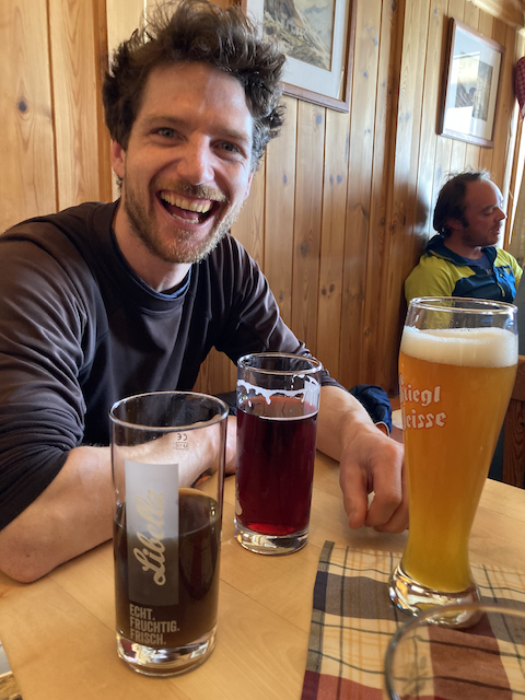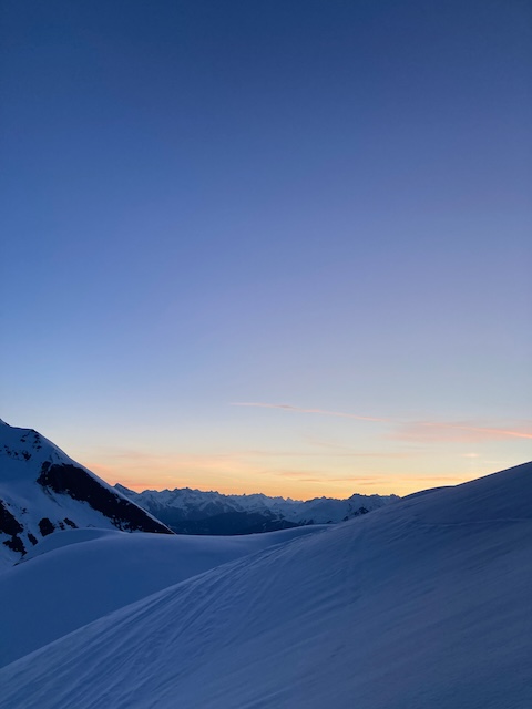 Weda sogt a Kaltfront zwischen 9-10Uhr, aiso Wecker auf 4:00 und los gehts um 4:30. Sonnenaufgang im Tiergarten, Gipfelschnaps um 7:30 kurz hintam Sporaturm weil zu vui Schnee drin. Schneeprofil bei ca. 38° grom, hod a relativ guad ghoidn (erst ausgelöst als da Leo drauf gsprunga is), aber wegam Weda dann doch umdraht. Super Abfahrt de ersten boa hundert Höhenmeter, dann harschig. No kurz aufe zum Öfakopf (300hm, 40min), um 9:30 hods dann aber gewaltig schnoi zuazong, desweng schnoi zruck zur Hüttn, nomoi schlaffa, Sauna und Essen! Geiler dog!