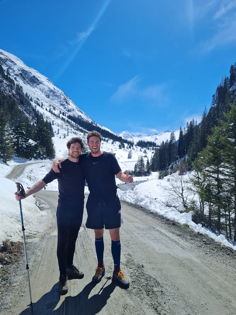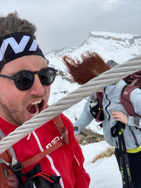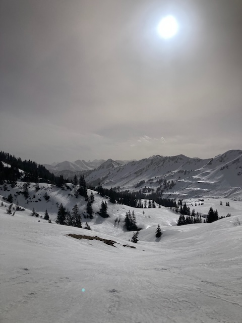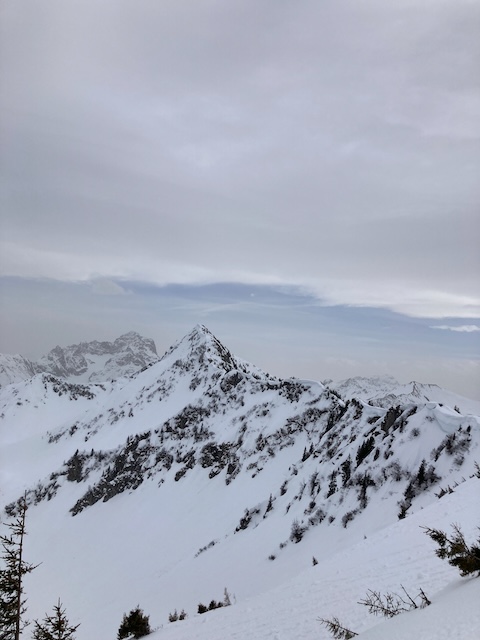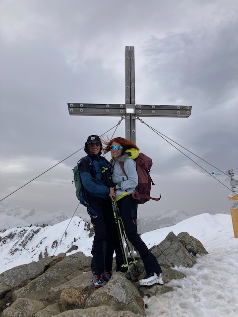 Mittag rum los kema mit Laura und Samy vom Parkplatz Ifen. Vui Leid unterwegs, vor allem a Fußgänger. An da Hüttn schnoi Zeig obglegt und dann no kurz aufs Steinmandl aufe (400hm, 50min). Schaut steiler und länger aus wias is. Oben hod ein unglaublicher Fönsturm blosn, das ma si sogar am Greiz festhoidn hod miassn. Vanessa hod Felle dahoam vagessen, dadurch leichter Verzögerung, aber alle pünktlich zum guadn Abendessen gschafft (Kaasspozzn).
