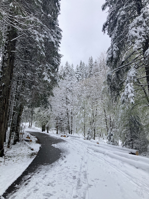 Kurz hinter Postalm mit de Ski, oben maßig, no ned z woach, wie im Winter.