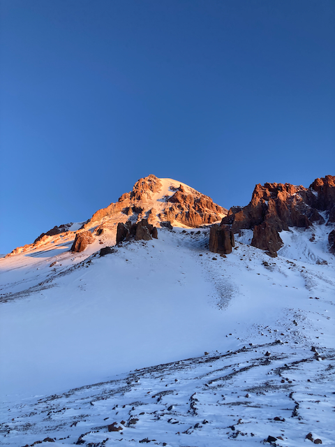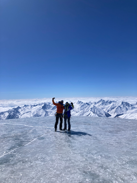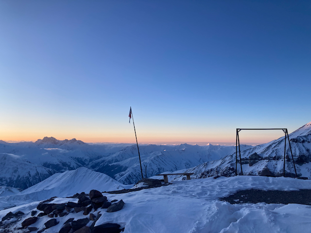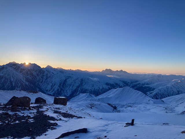 Da uns alle abgeraten ham und gsogt ham, dass de Bedinungen schlecht san hamma an Kazbeg Gipfel nimma fokusiert. Um 8:15 samma dann relativ guad ausgschlaffa trotzdem Richtung Plateau gestartet. Bedinungen warn bis aufn wenigen Schnee aber guad und mia san ohne Probleme zum 100hm höher gelegenen Spartacus auf 4500m kema, wenn a mit größter Müh (zumindest bei mir :D). Da Kazbeg selber hod a relativ große Spaltn ghabt und oben greisligs Blankeis. Mit 1 Fuß in Russland hod ma da oben an unglaublich geilen Ausblick! Insgesamt a wahnsinns Tour!