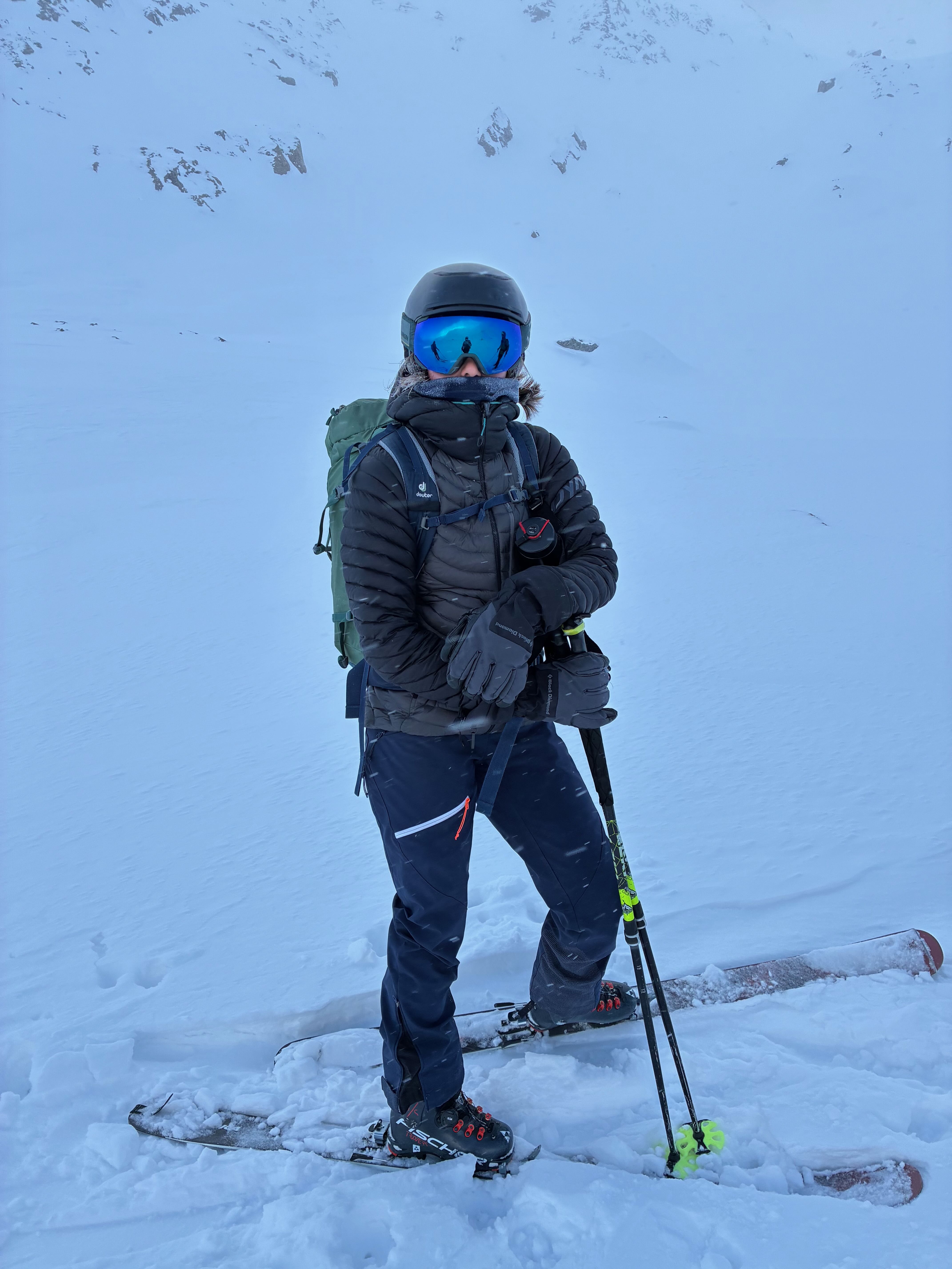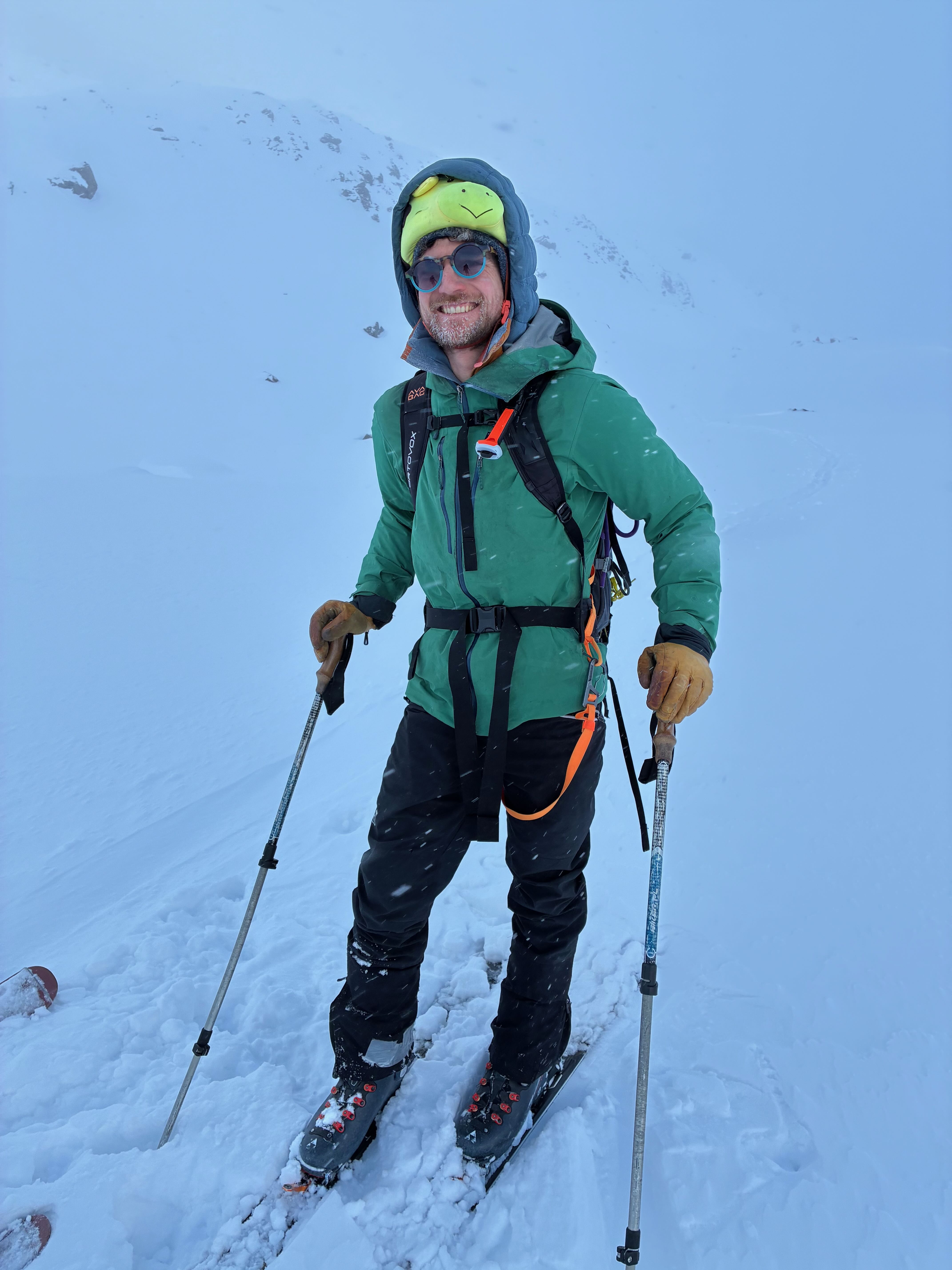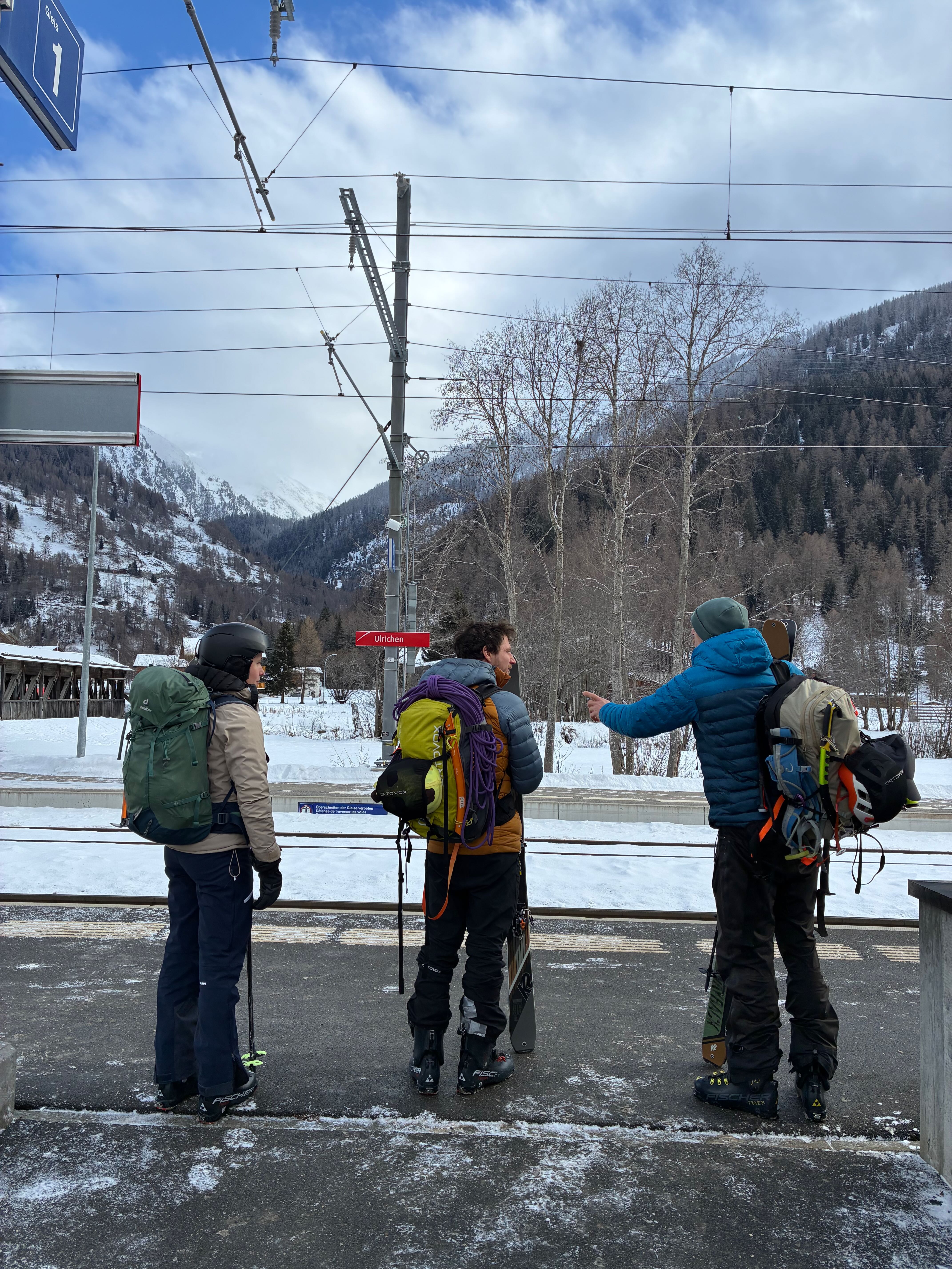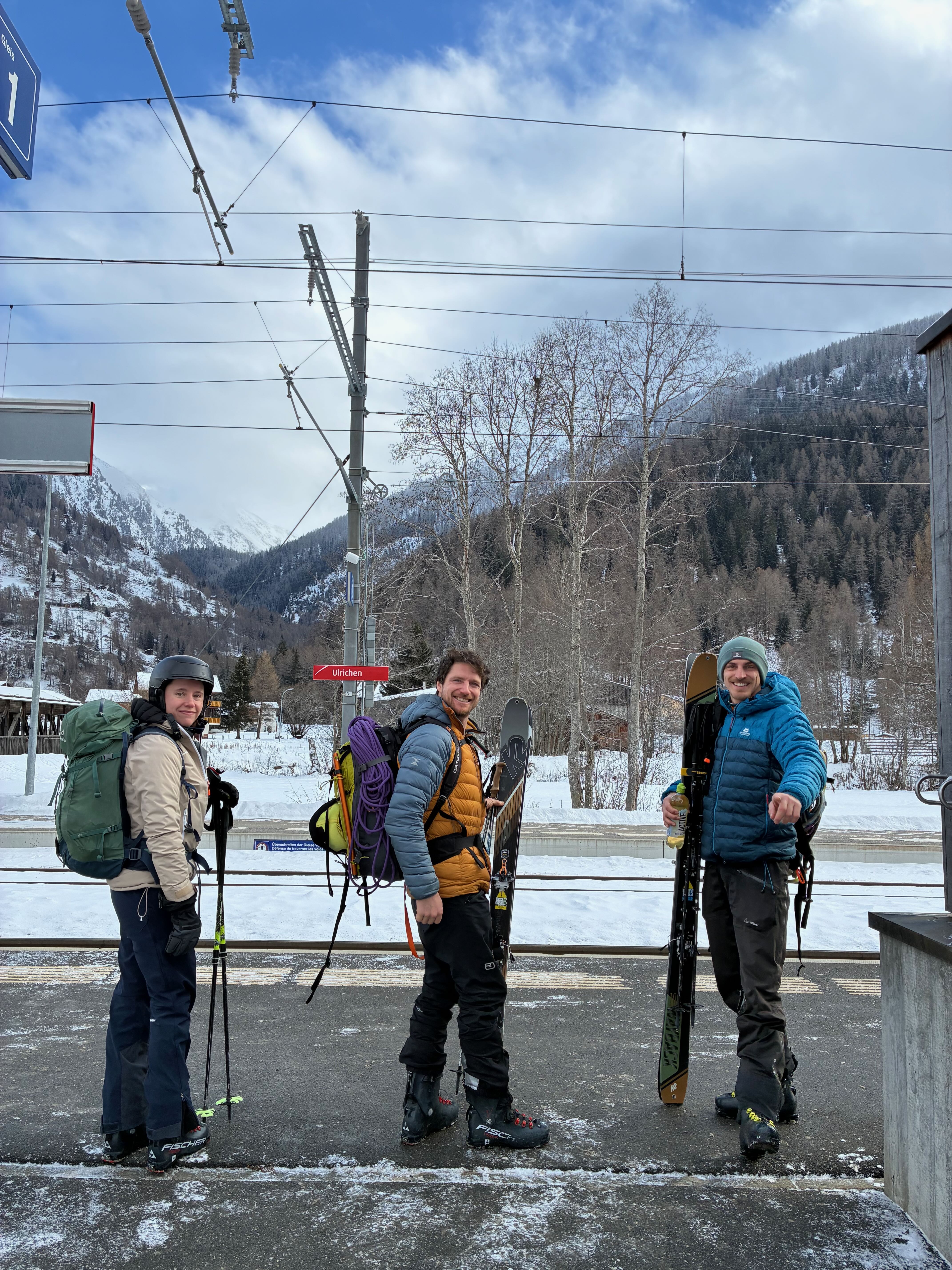 Letzter Dog unserer Skisafari. Nachdems in da Nacht doch 10-20cm gschnim hod, hamma no den Hang Richtung Griesscharte mitgnumma (solang ma hoid wos gseng hod) und de Abfahrt war de beste vom ganzen Trip! Mega Buiver! Dann mühsam Richtung Windradl gsuacht mit GPS, de Straß war brutal eiblosn, deswegn directissima und dann Einstieg in den Hang ins Tal gsuacht. Da hods ghuifa, dass kurz aufzong hod und ma gseng hod dass scho geht. Ohne Sicht is des scho einfach grob. Dann nomoi subba Buiverhang mitgnumma und über de Passstraß nach Ulrichen ausgefahn/gschom. Leider hods d Samy no auf da Eisplattn glegt und an Daumen a weng gstaucht. Dafür hamma beim Warten aufn Zug no an guadn Croque-Monsieur griagd - herrlicher Abschluss von so am schena Ausflug!
