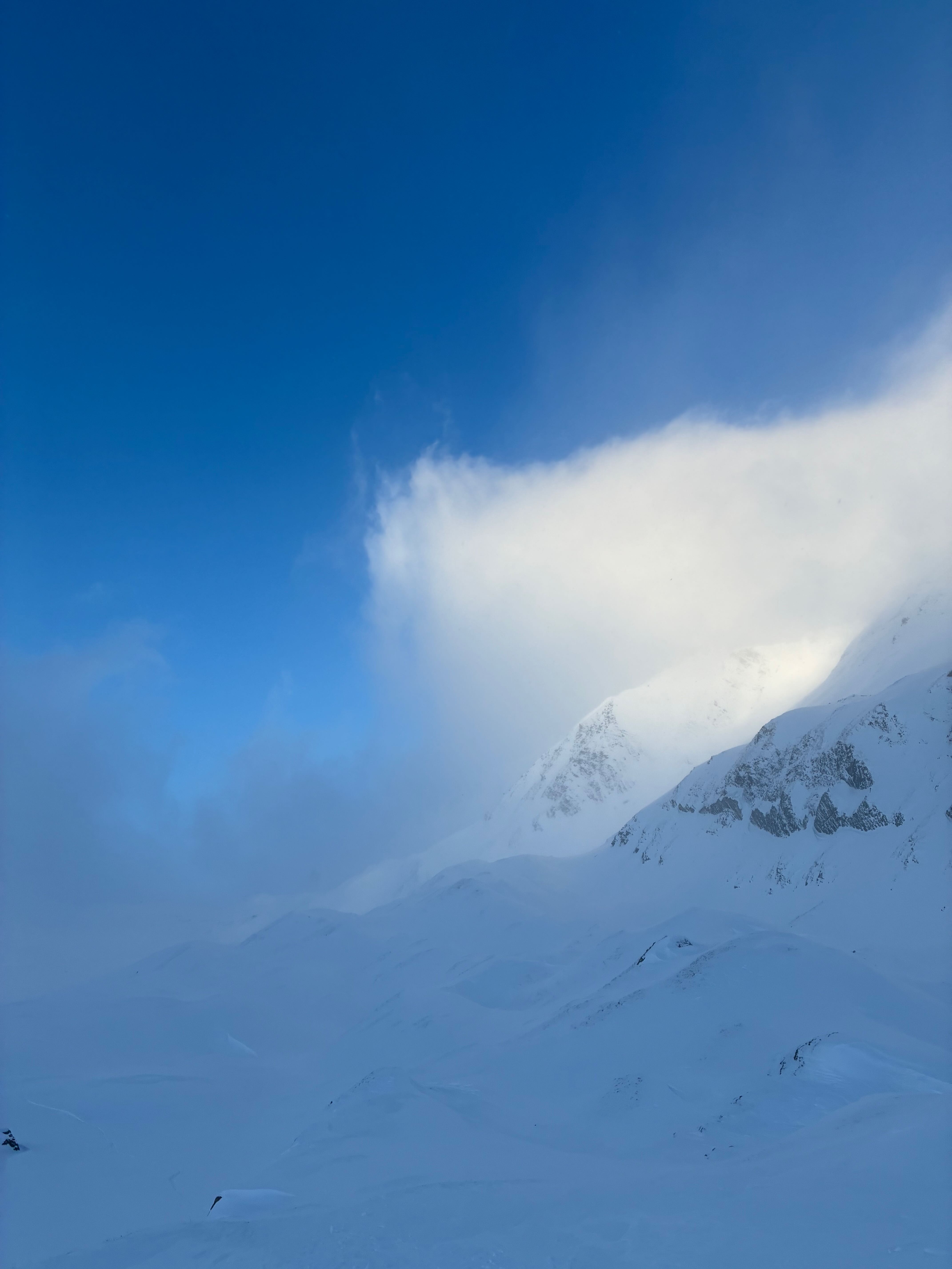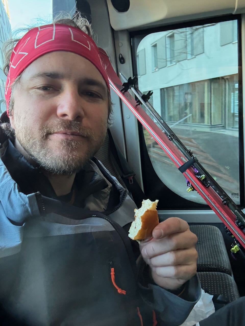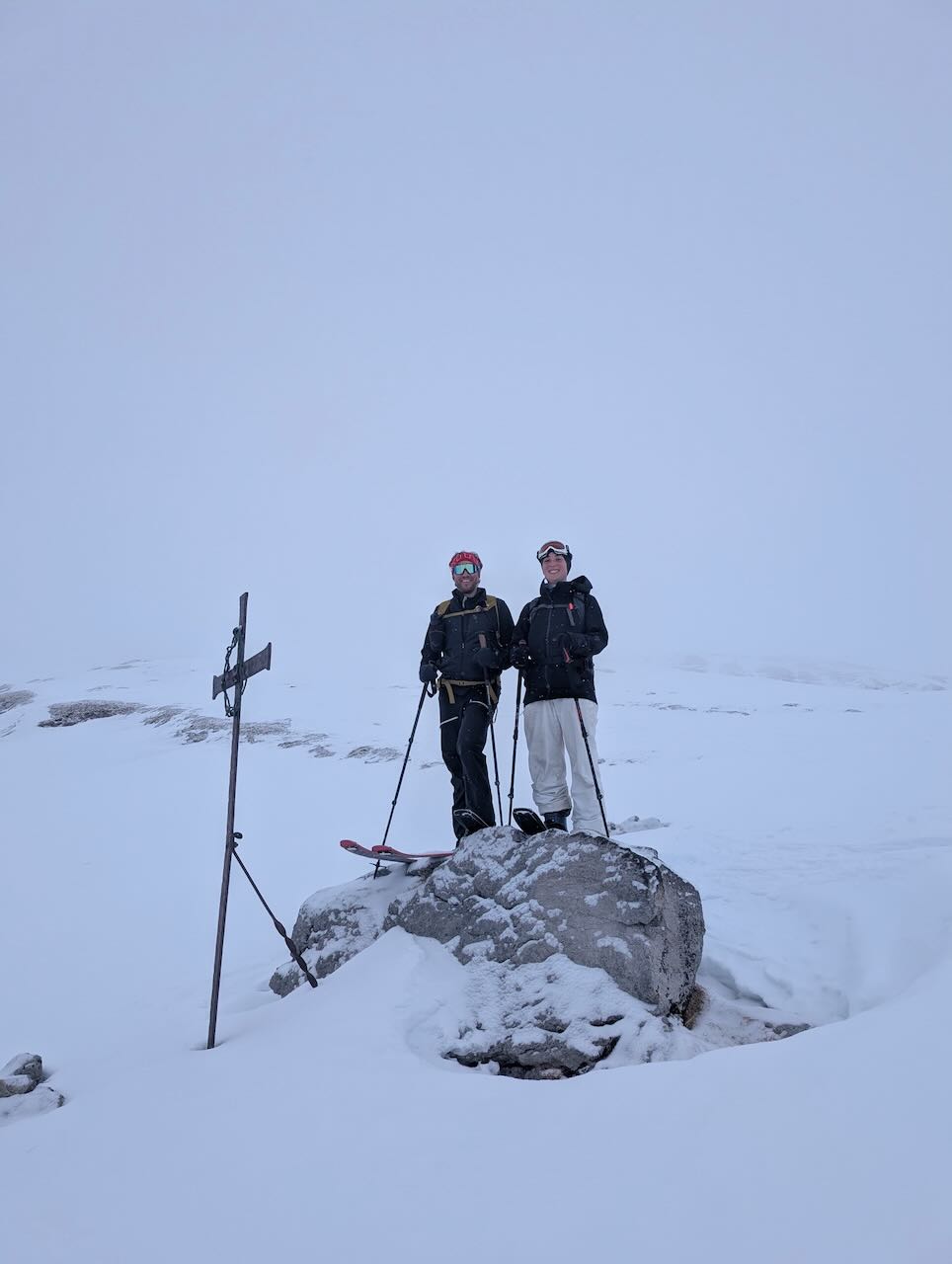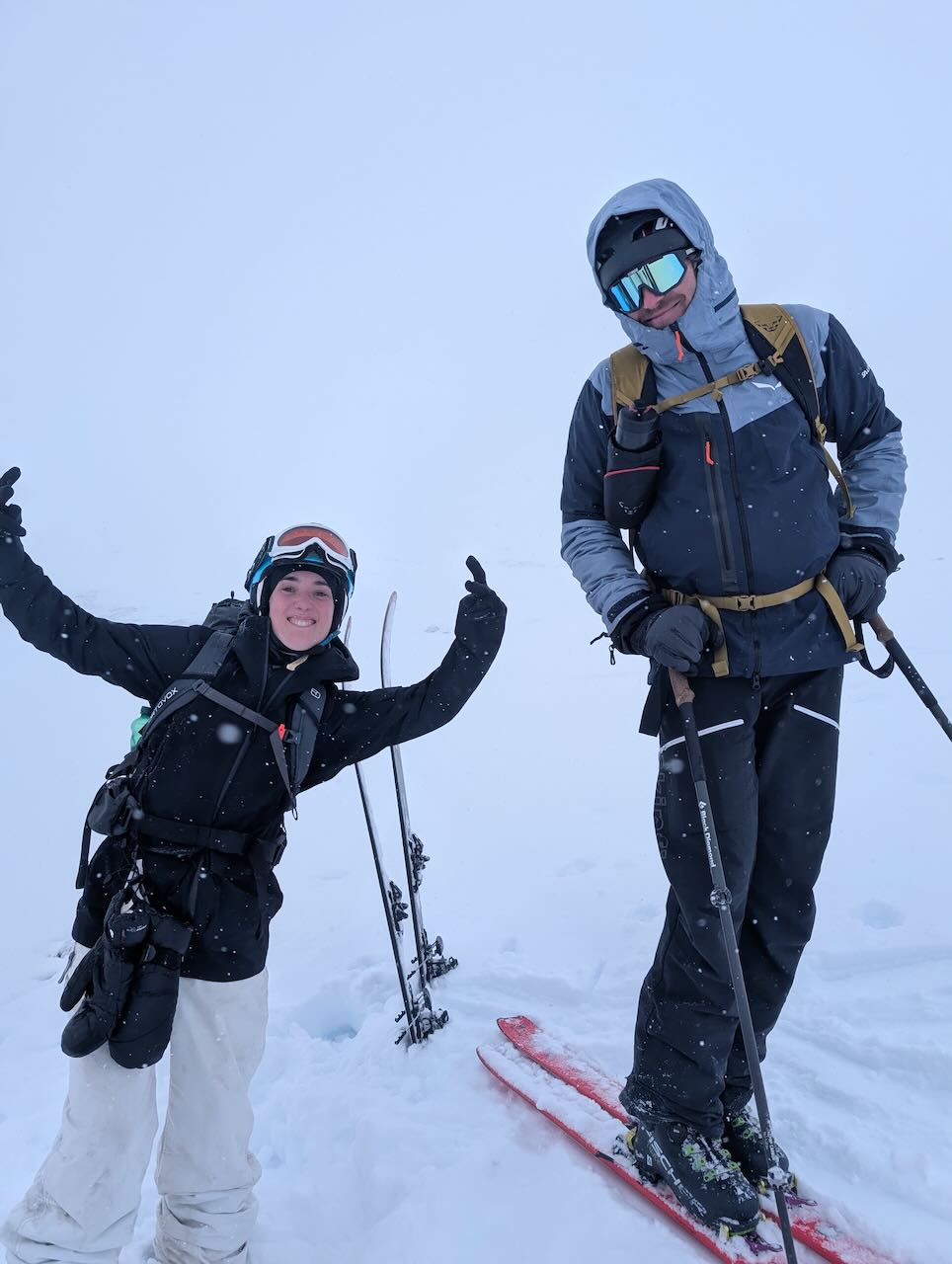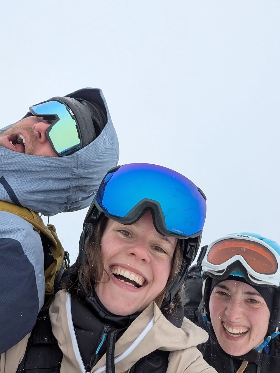 Letzter Dog unserer Skisafari. Nachdems in da Nacht doch 10-20cm gschnim hod, hamma no den Hang Richtung Griesscharte mitgnumma (solang ma hoid wos gseng hod) und de Abfahrt war de beste vom ganzen Trip! Mega Buiver! Dann mühsam Richtung Windradl gsuacht mit GPS, de Straß war brutal eiblosn, deswegn directissima und dann Einstieg in den Hang ins Tal gsuacht. Da hods ghuifa, dass kurz aufzong hod und ma gseng hod dass scho geht. Ohne Sicht is des scho einfach grob. Dann nomoi subba Buiverhang mitgnumma und über de Passstraß nach Ulrichen ausgefahn/gschom. Leider hods d Samy no auf da Eisplattn glegt und an Daumen a weng gstaucht. Dafür hamma beim Warten aufn Zug no an guadn Croque-Monsieur griagd - herrlicher Abschluss von so am schena Ausflug!