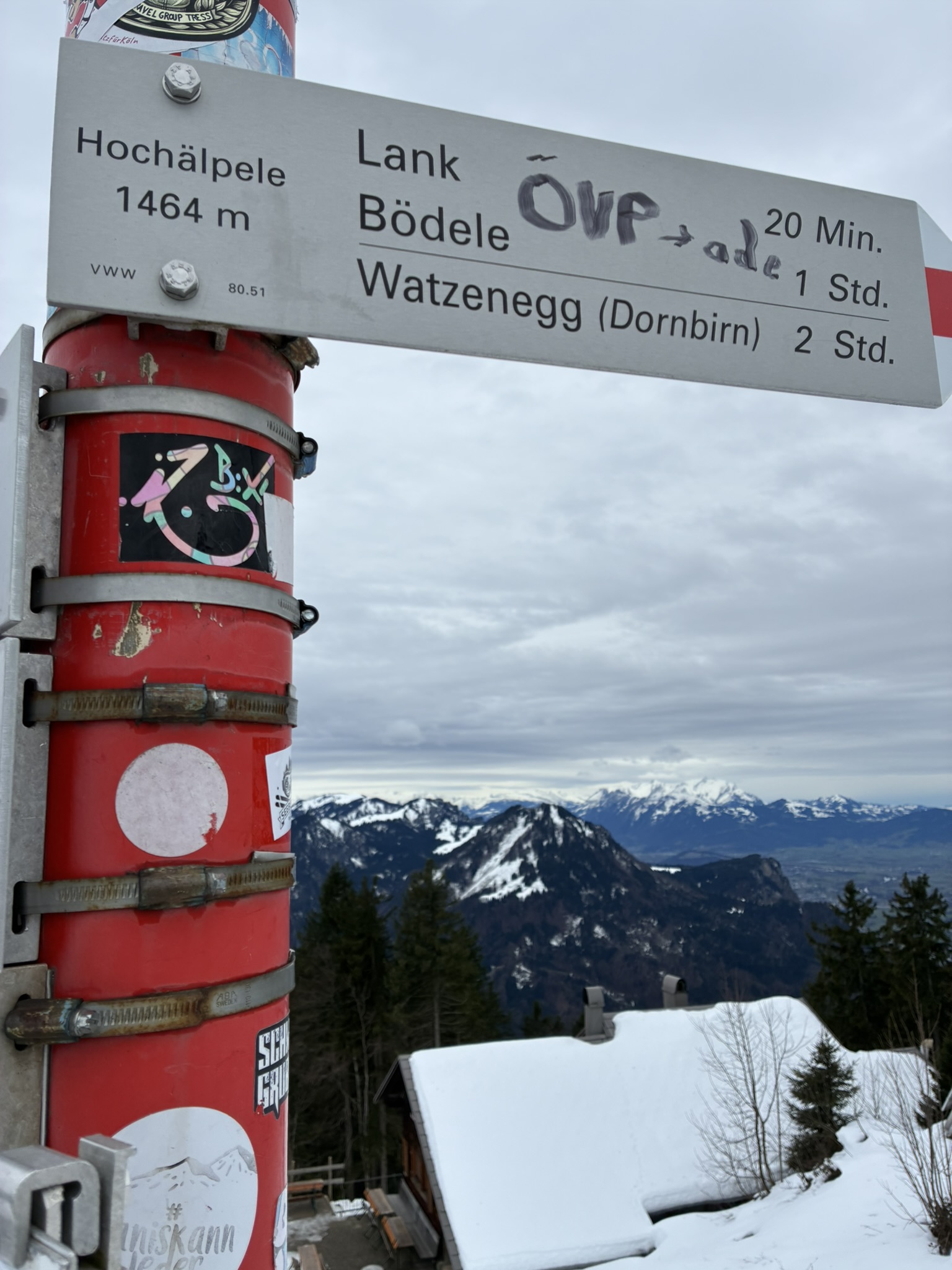 Francis erste Tour heia! Dieses moi aufs Hochälpele von da andern Seitn - richtig lässiger Weg, ganz wos anders. Man hoid si unten scho relativ weit links und geht über Hüttevorsäß zum Winterwanderweg der zur Lustenauer Hüttn rüber geht. Dann koma links außen rum zum Gipfel. Hüttn hod leider nix mehr zum Essen ghabt, was ned wenig leid enttäuscht hod, Linzer Schnitte war dafür guad. Unten no an kurzen Einkehrschwung im Pilz - subba Abschluss für a schena Ausflug!