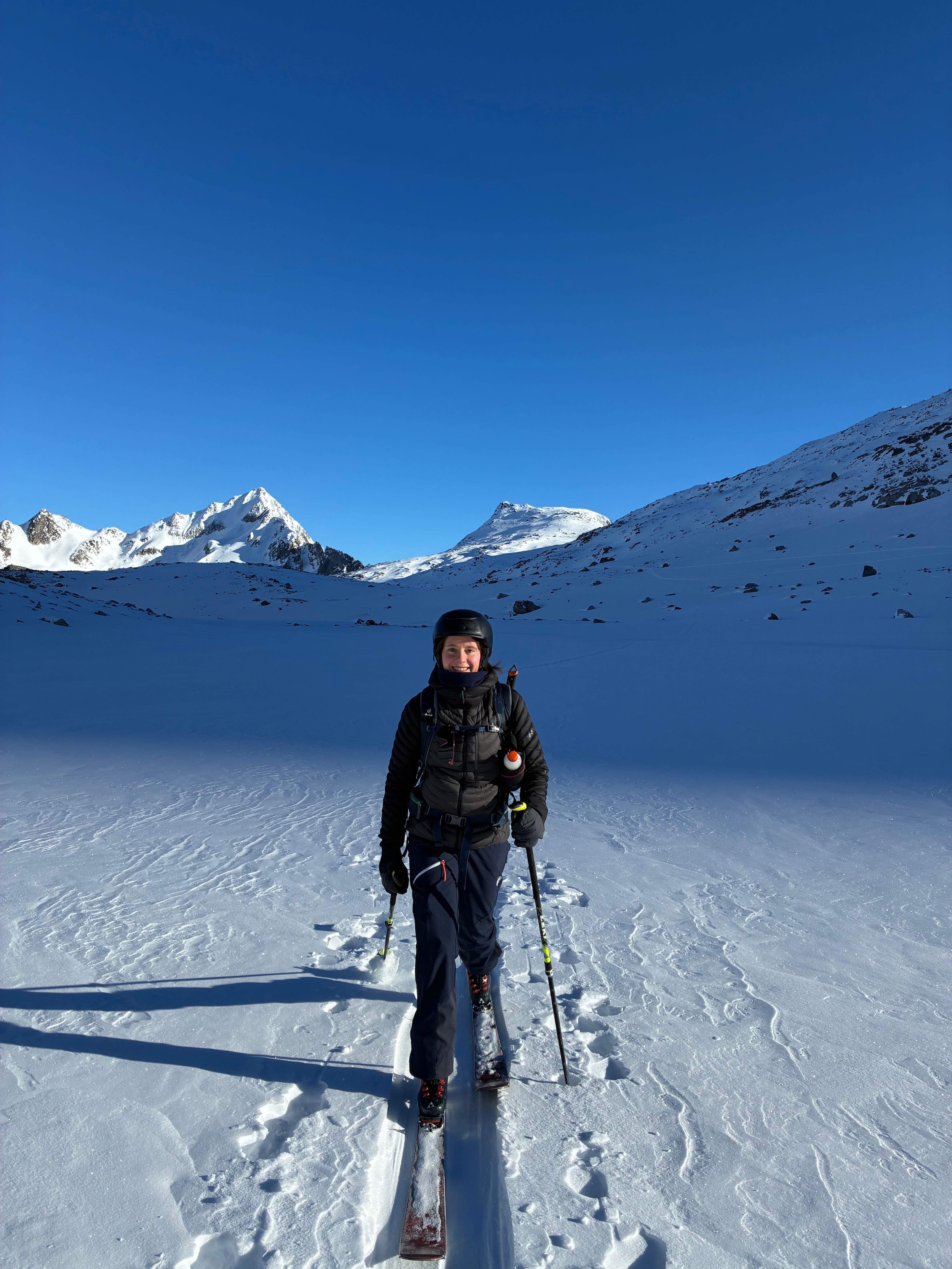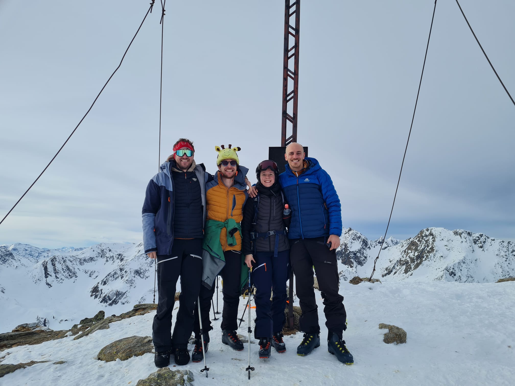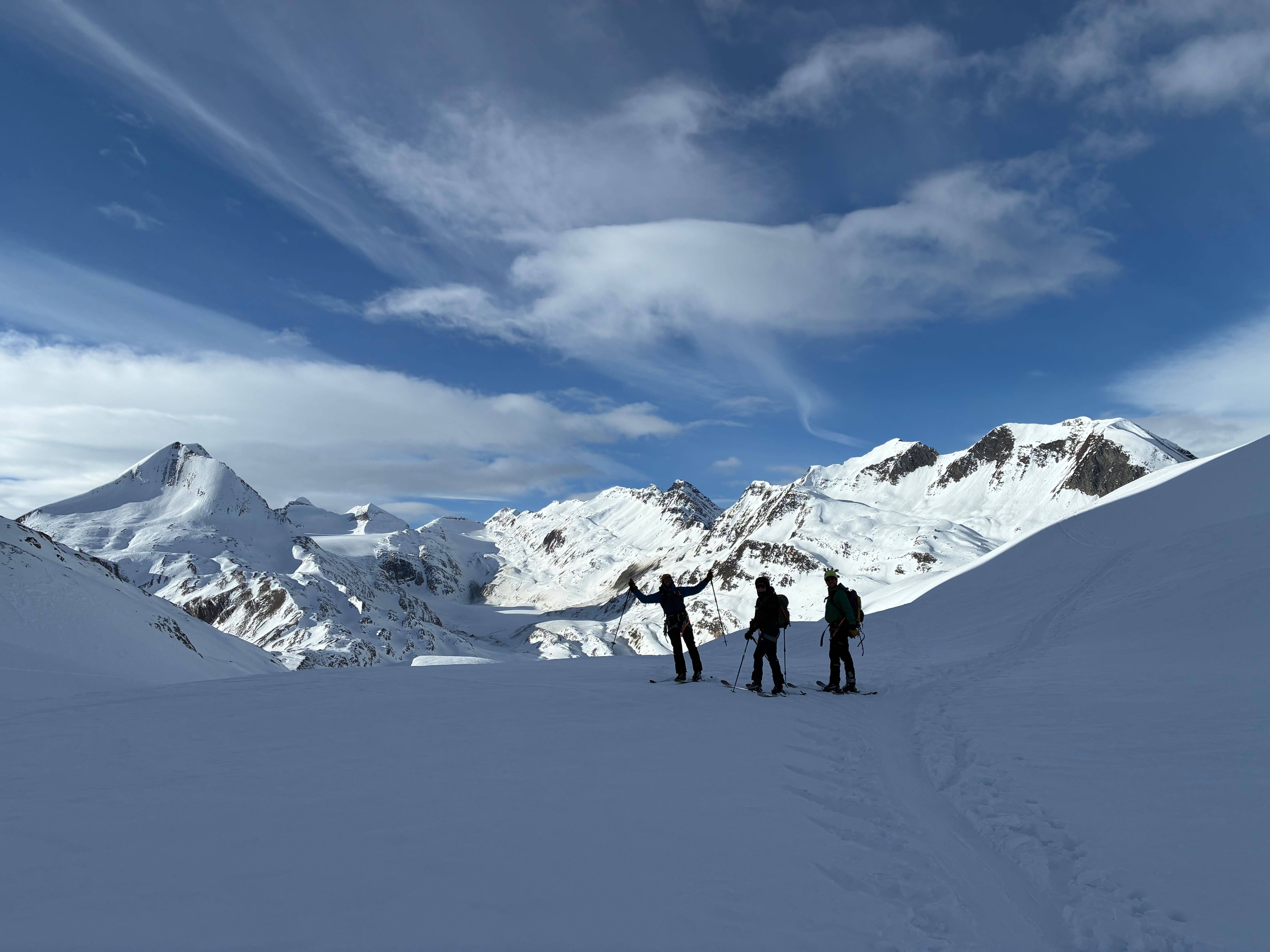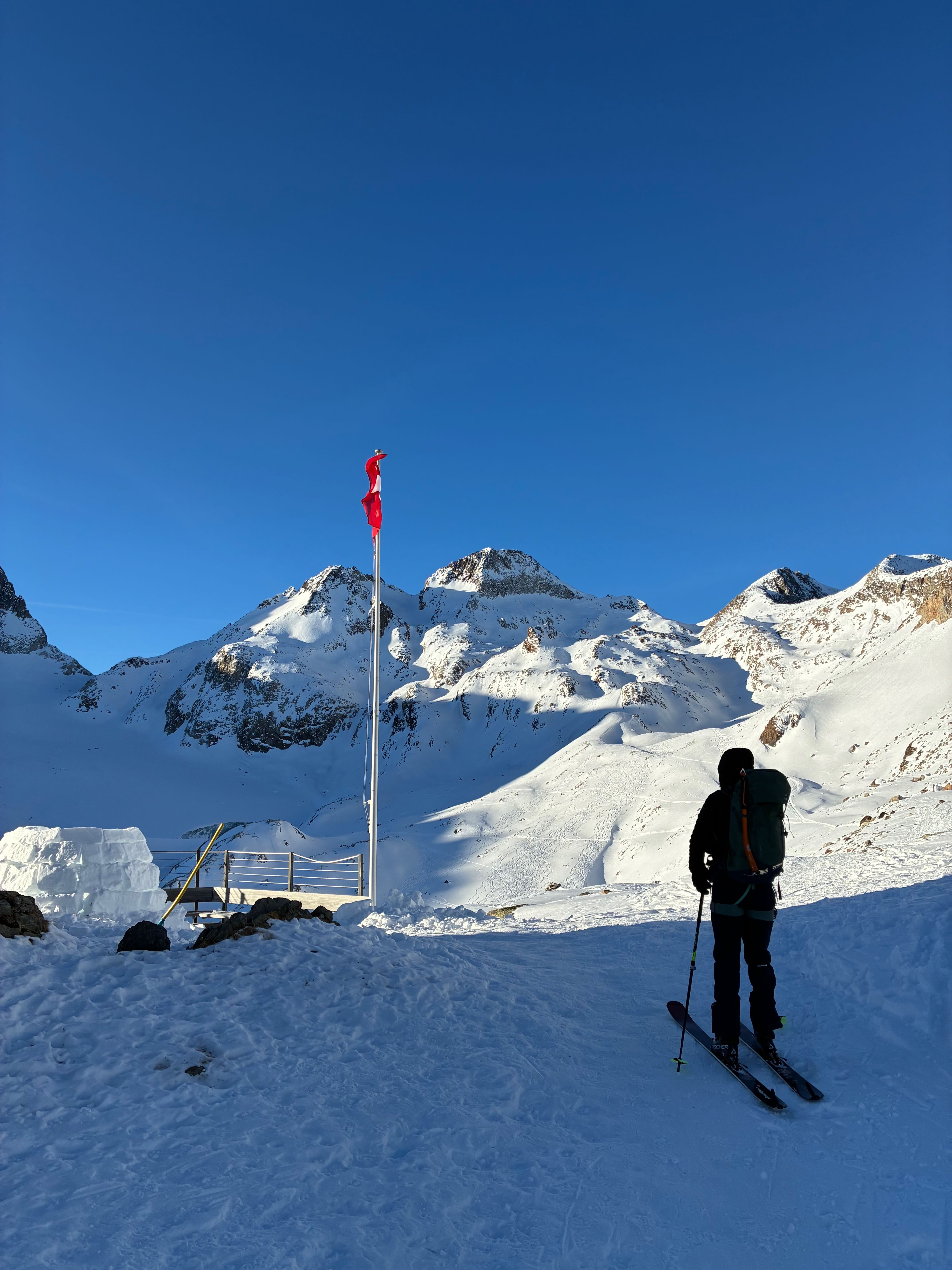 Auf zum Pizzo Lucendro! Erst moi schene Abfahrt mit Nasenbluten ins Loch, dann Aufstieg in die Scharte mit a boa andere und hinten rum zum Skidepot. De letzten Meter z Fuaß zum Gipfe, dann mit de Ski den steilen Hang obe, inkl Leos Ski-Sprung-Pfurz! Wunderbare Abfahrt, fast immer no mit na neia Spur in Buiver. Ursprüngliche Idee zum Hüenersattel rüberzuqueren hod ned funktioniert, deswegen abm Loch aufe Richtung Witenwasserengletscher. De andern san dann no aufe, Samy und i zruck Richtung Hüttn - a sau schene Rundtour! Um 5e hods dann Aperó vo de Wirtsleid gem mit gratis Glühwein und Snacks, a absoluter Traum. Nach ca. 6 Weißbier pro Person und 2,5L Wein de ma aufadrong ham, war's dann endlich soweit: 2026! Außer uns warn nur no de 3er Gruppn neben uns und de lustigen Schweizer auf, a brutal lustiger Abend :D