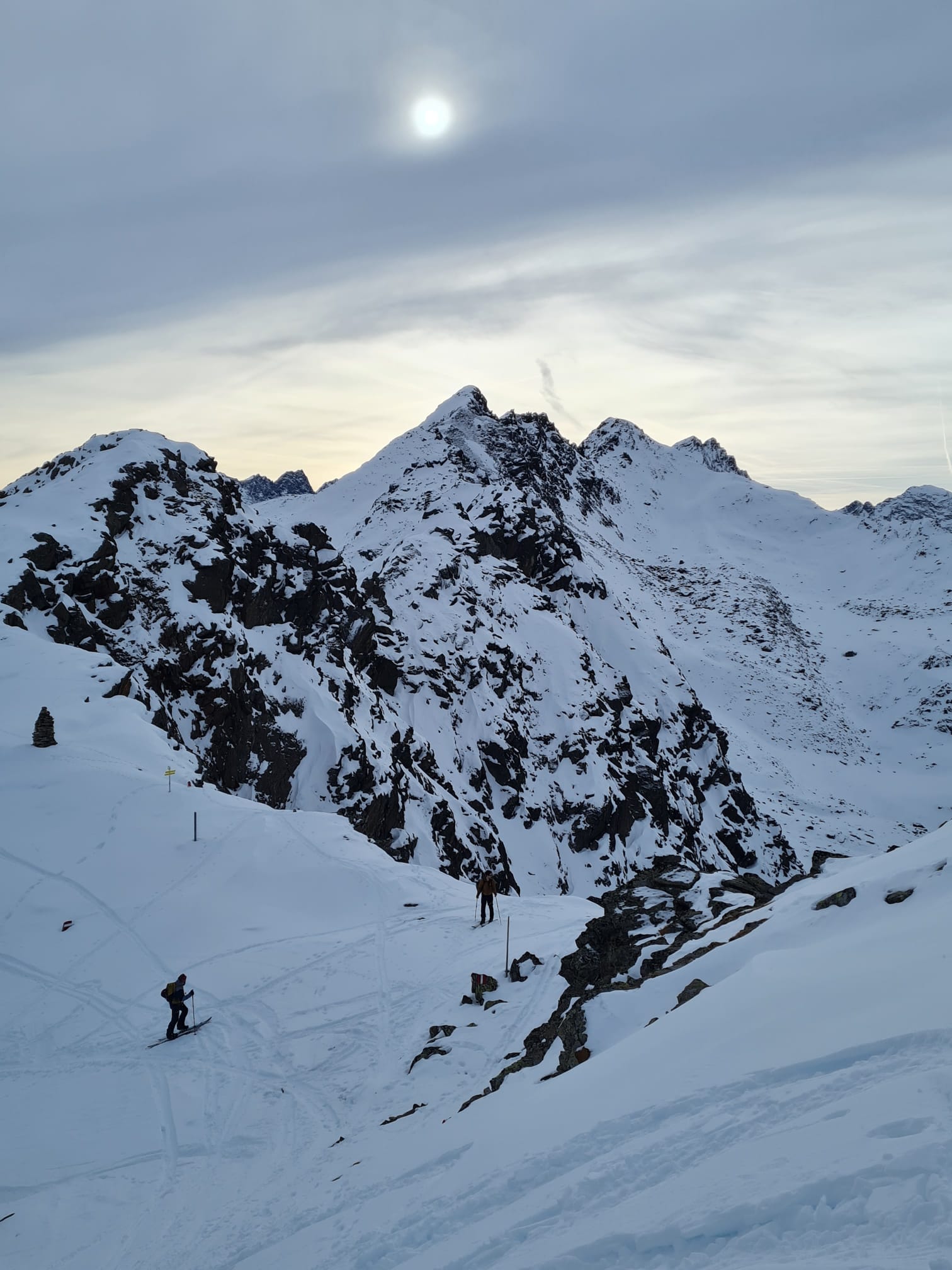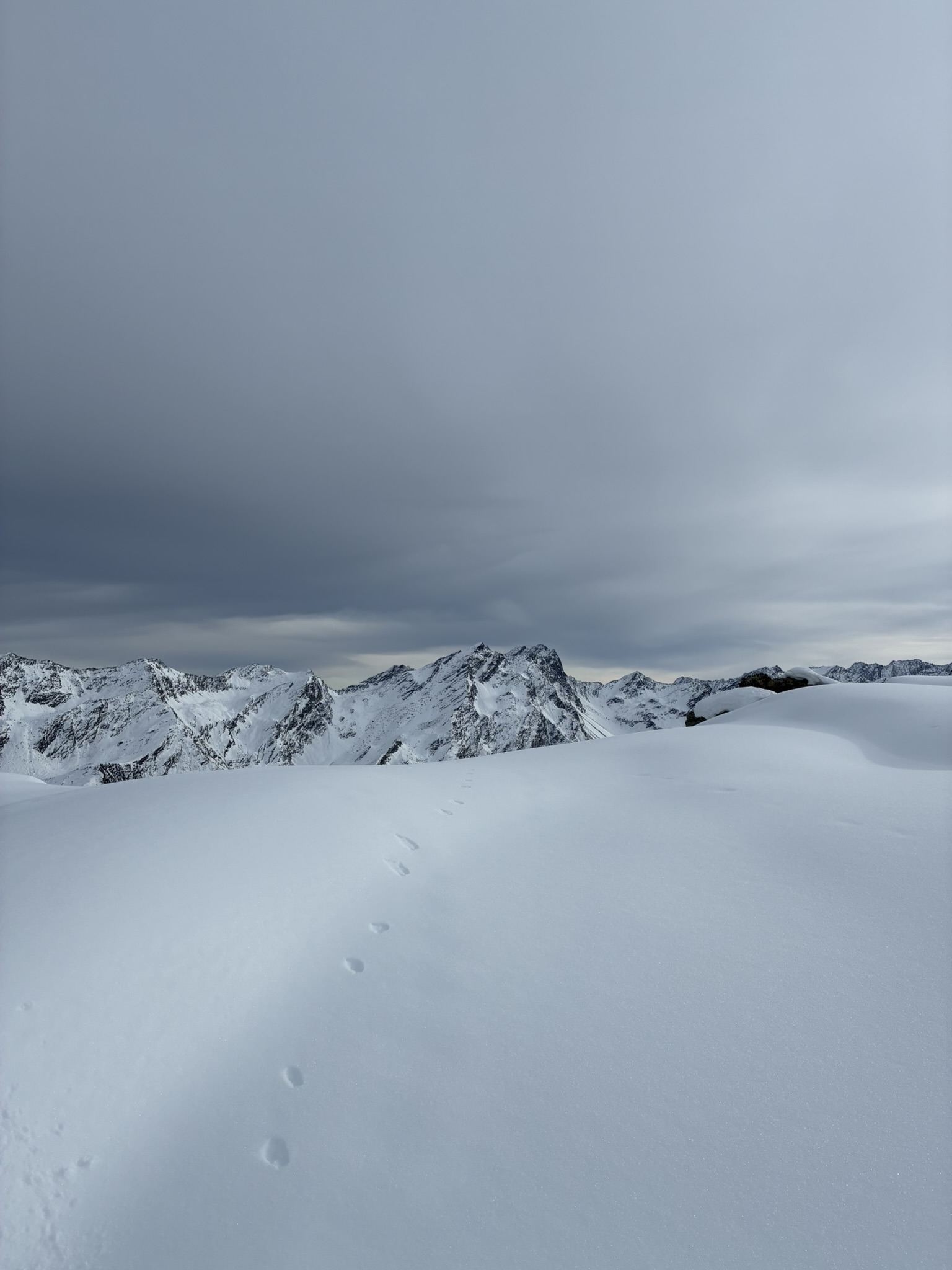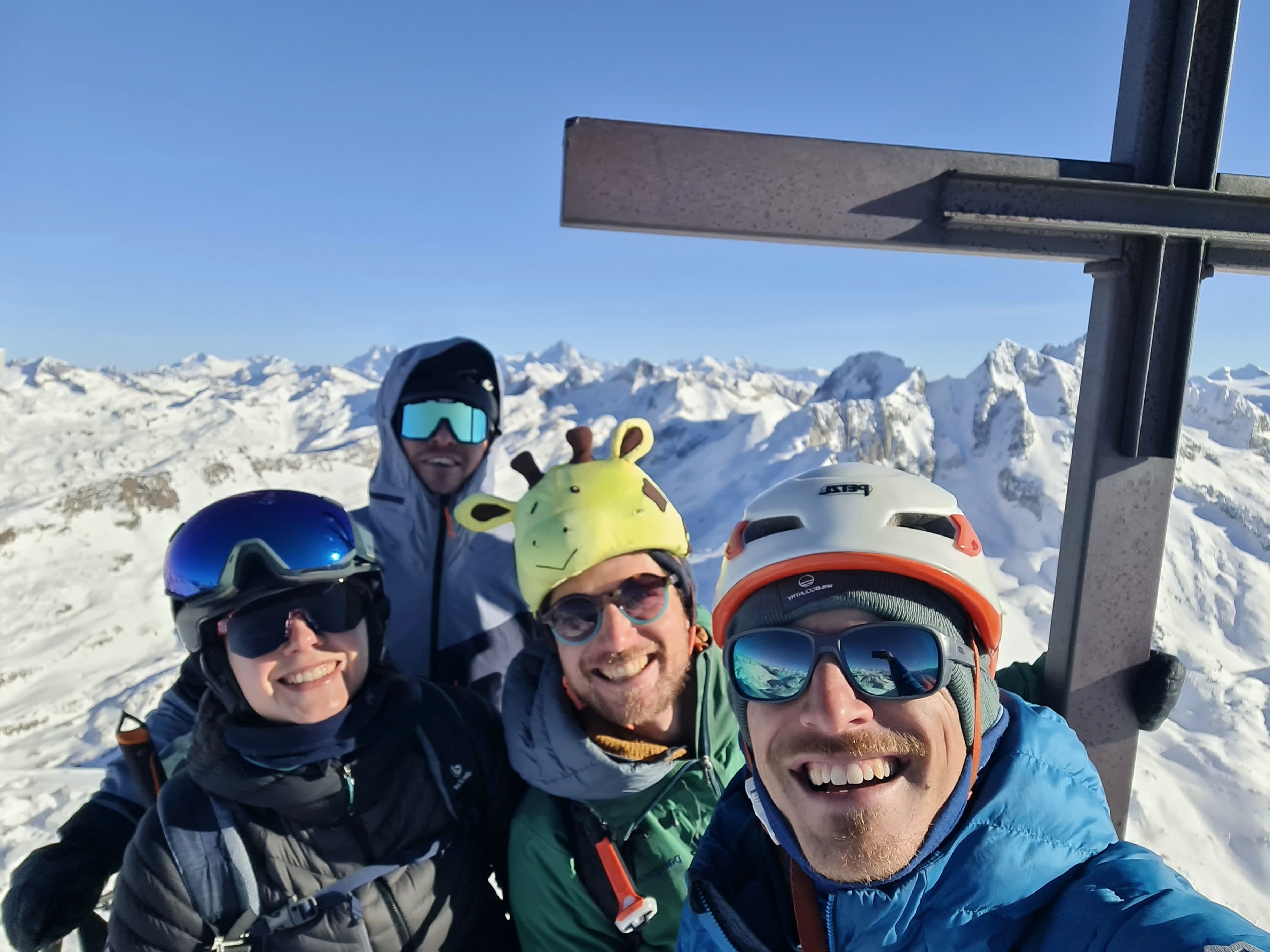 Auf zum Pizzo Lucendro! Erst moi schene Abfahrt mit Nasenbluten ins Loch, dann Aufstieg in die Scharte mit a boa andere und hinten rum zum Skidepot. De letzten Meter z Fuaß zum Gipfe, dann mit de Ski den steilen Hang obe, inkl Leos Ski-Sprung-Pfurz! Wunderbare Abfahrt, fast immer no mit na neia Spur in Buiver. Ursprüngliche Idee zum Hüenersattel rüberzuqueren hod ned funktioniert, deswegen abm Loch aufe Richtung Witenwasserengletscher. De andern san dann no aufe, Samy und i zruck Richtung Hüttn - a sau schene Rundtour! Um 5e hods dann Aperó vo de Wirtsleid gem mit gratis Glühwein und Snacks, a absoluter Traum. Nach ca. 6 Weißbier pro Person und 2,5L Wein de ma aufadrong ham, war's dann endlich soweit: 2026! Außer uns warn nur no de 3er Gruppn neben uns und de lustigen Schweizer auf, a brutal lustiger Abend :D